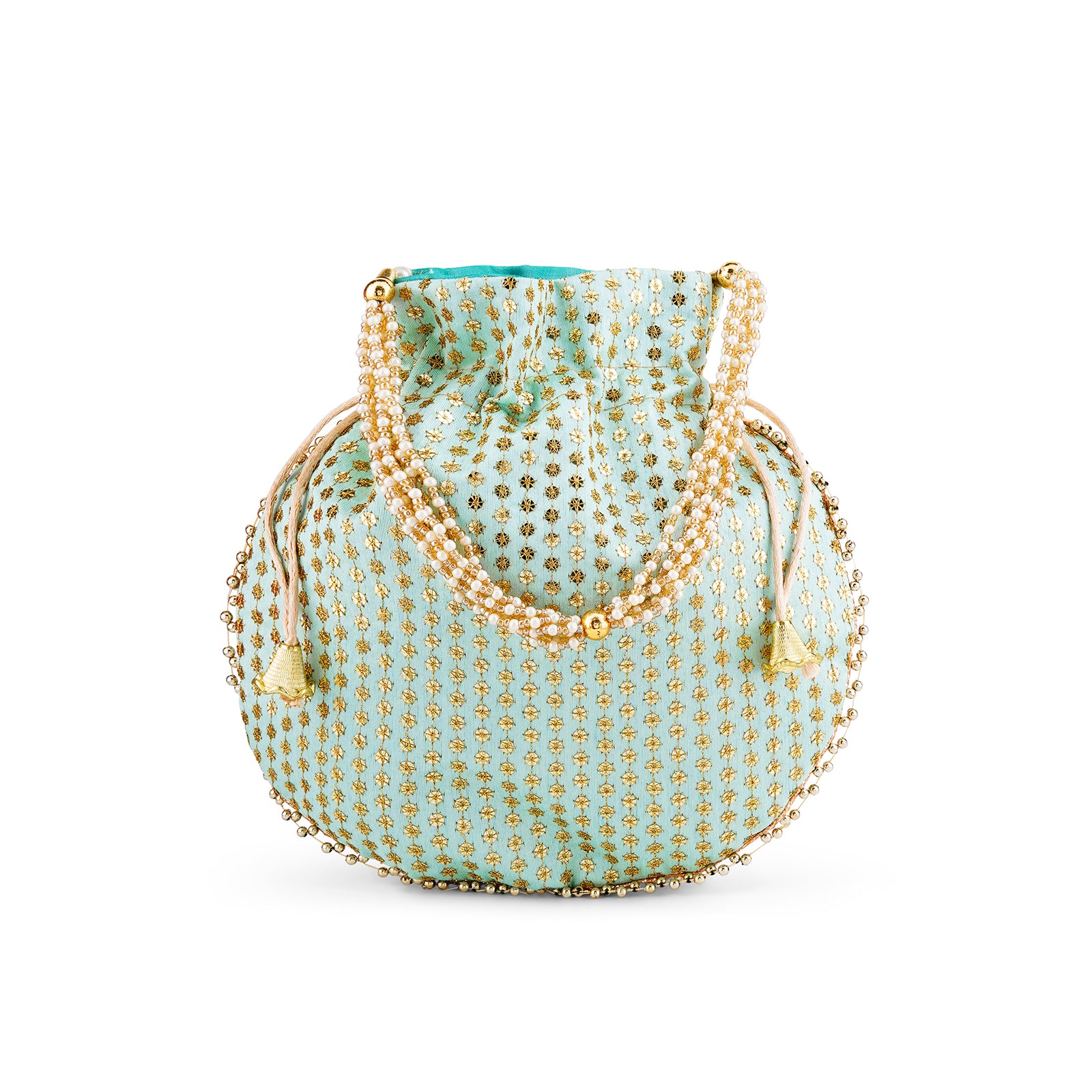 The Rimjhim Gire Saawan Sea Green Zari Embroidered Potli Bag embodies timeless elegance. Adorned with beautiful embroidery, it adds a touch of grace to any traditional outfit