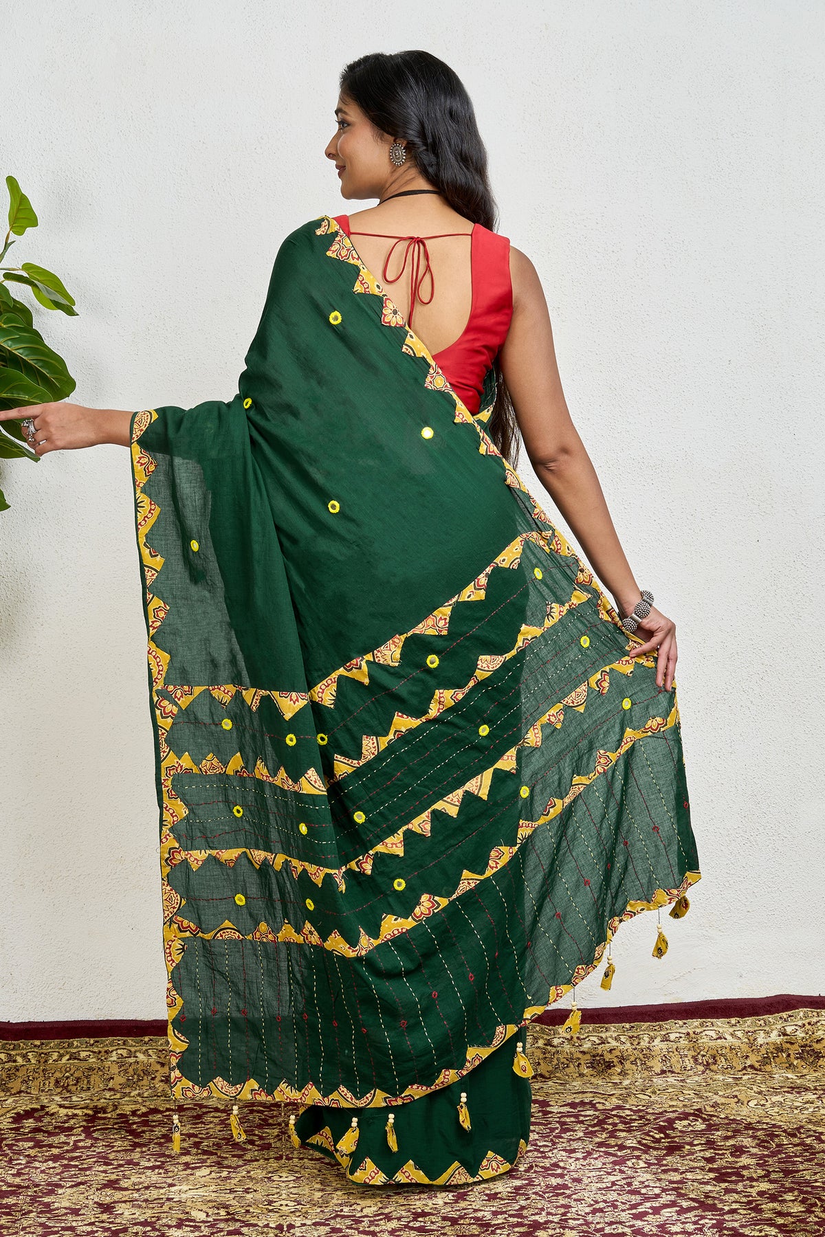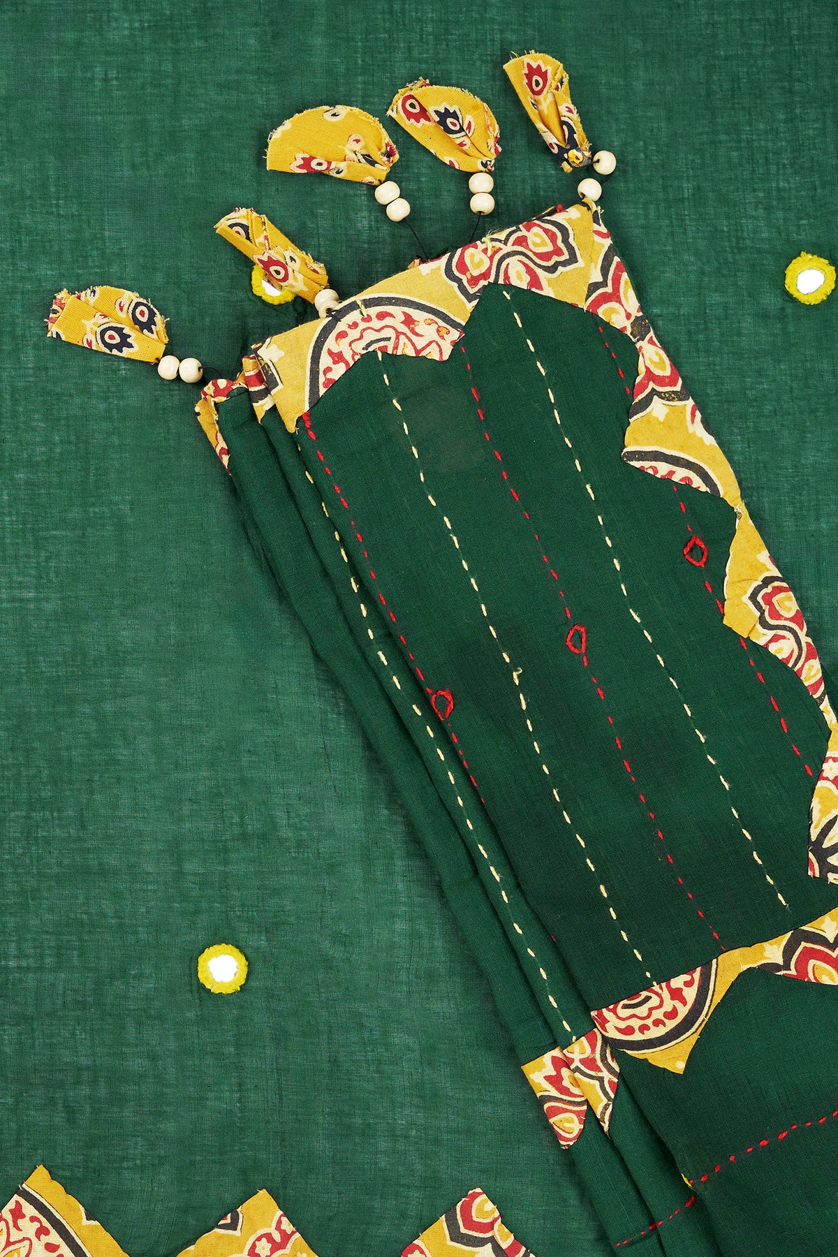 Haruniya Deep Green & Yellow Applique & Mirror Work Saree - SA