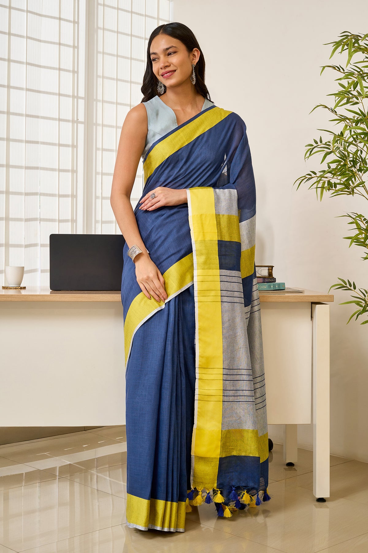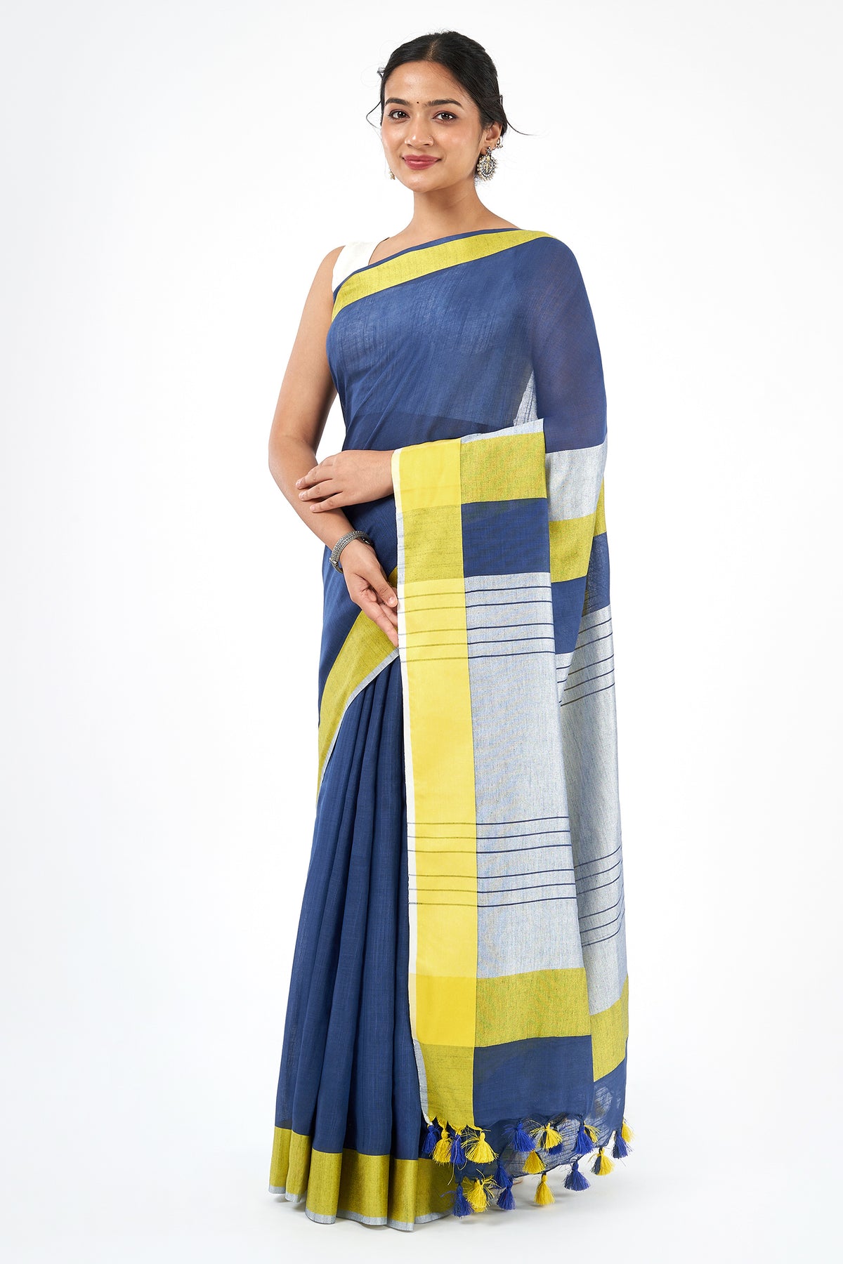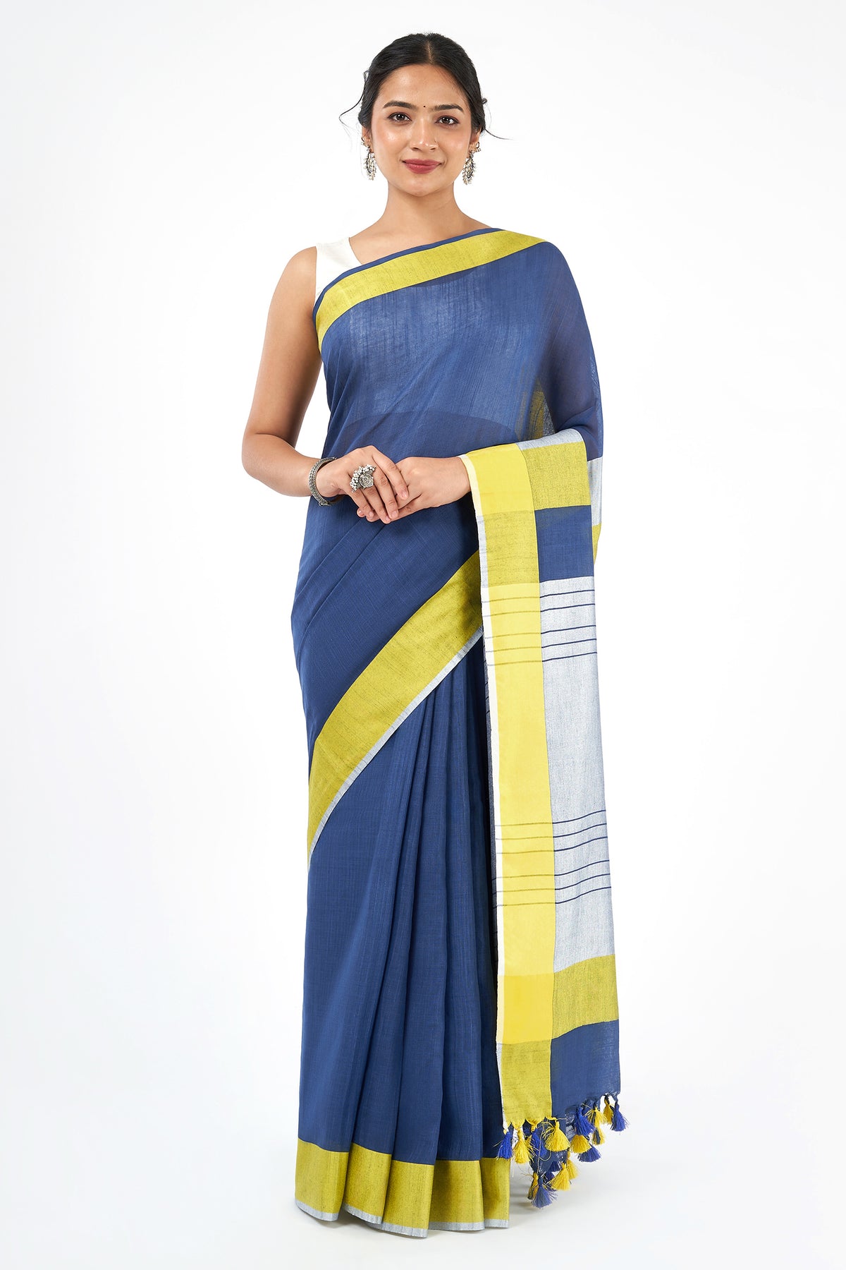 Make a composed statement in Eleganza, where deep navy meets Lime Yellow. This cotton blend saree strikes the perfect balance between bold and calm—ideal for office wear or intimate gatherings.