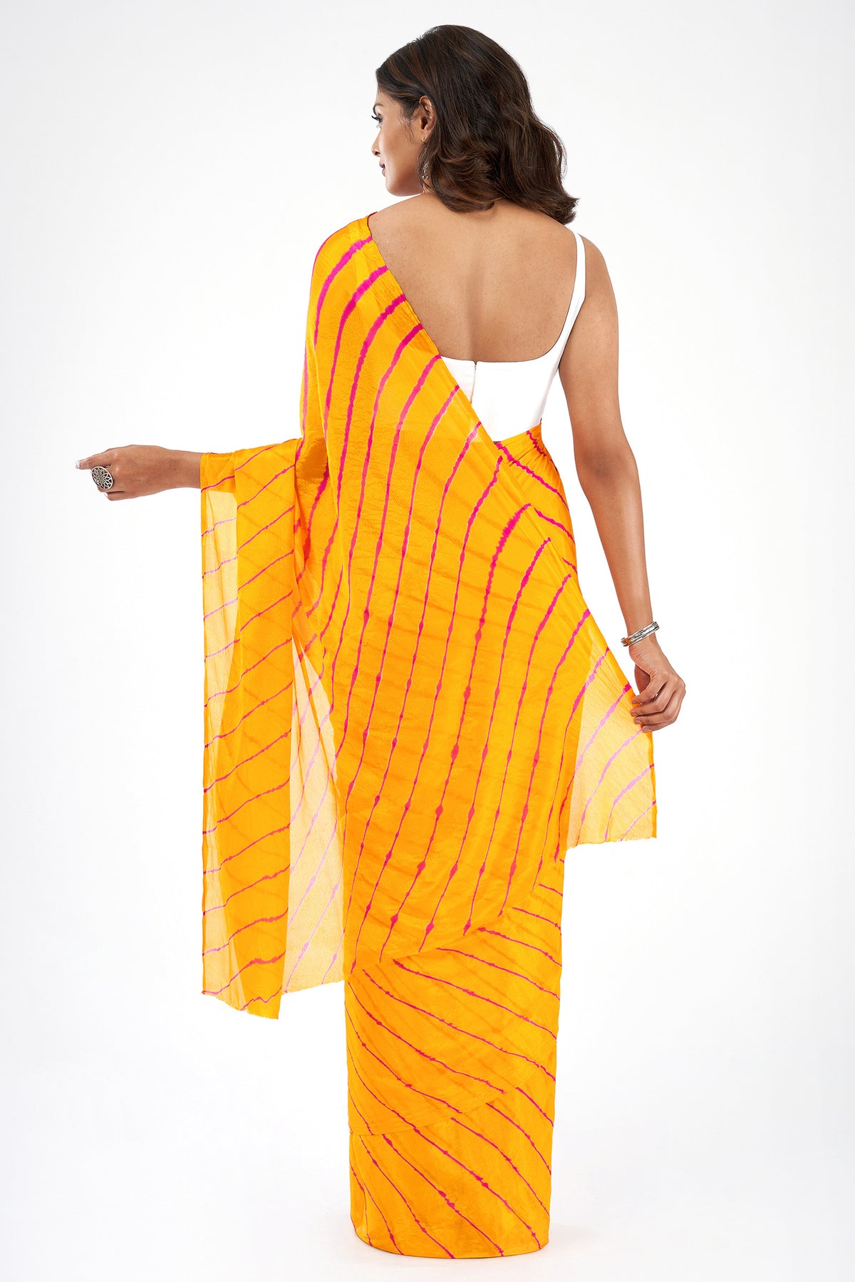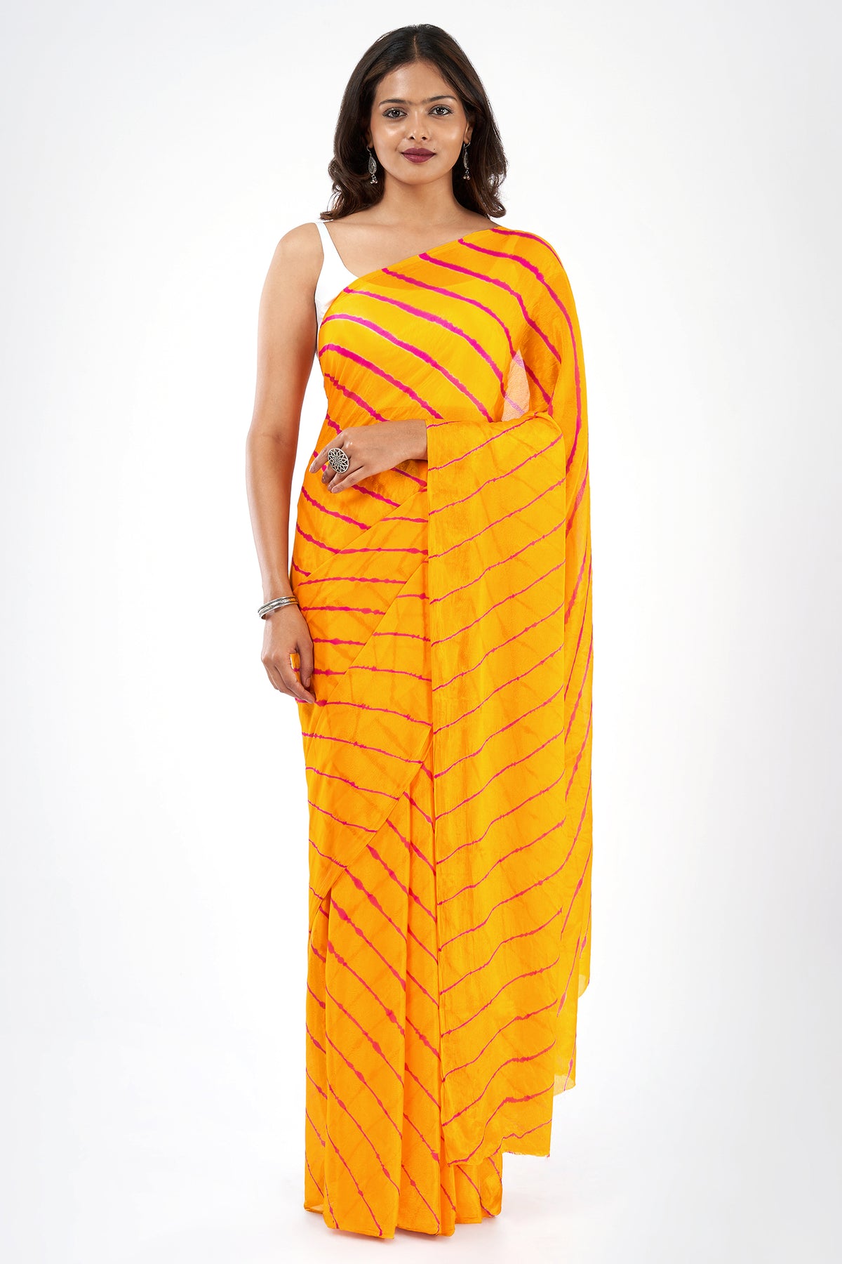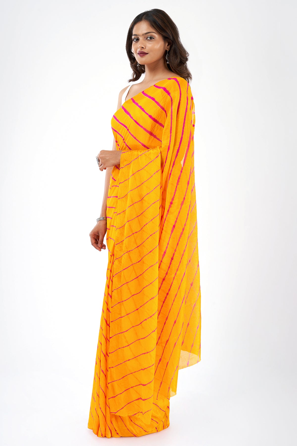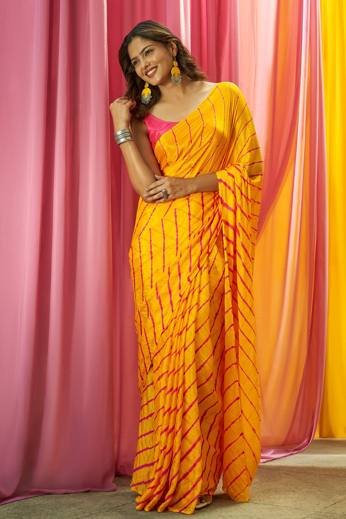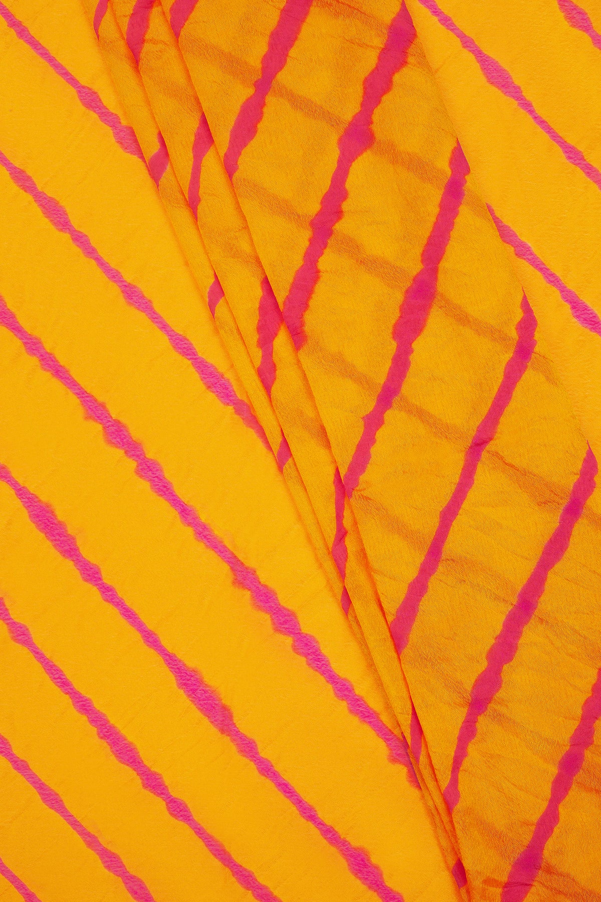 Teejh Guldasta Chinon Yellow and Pink Leheriya Saree