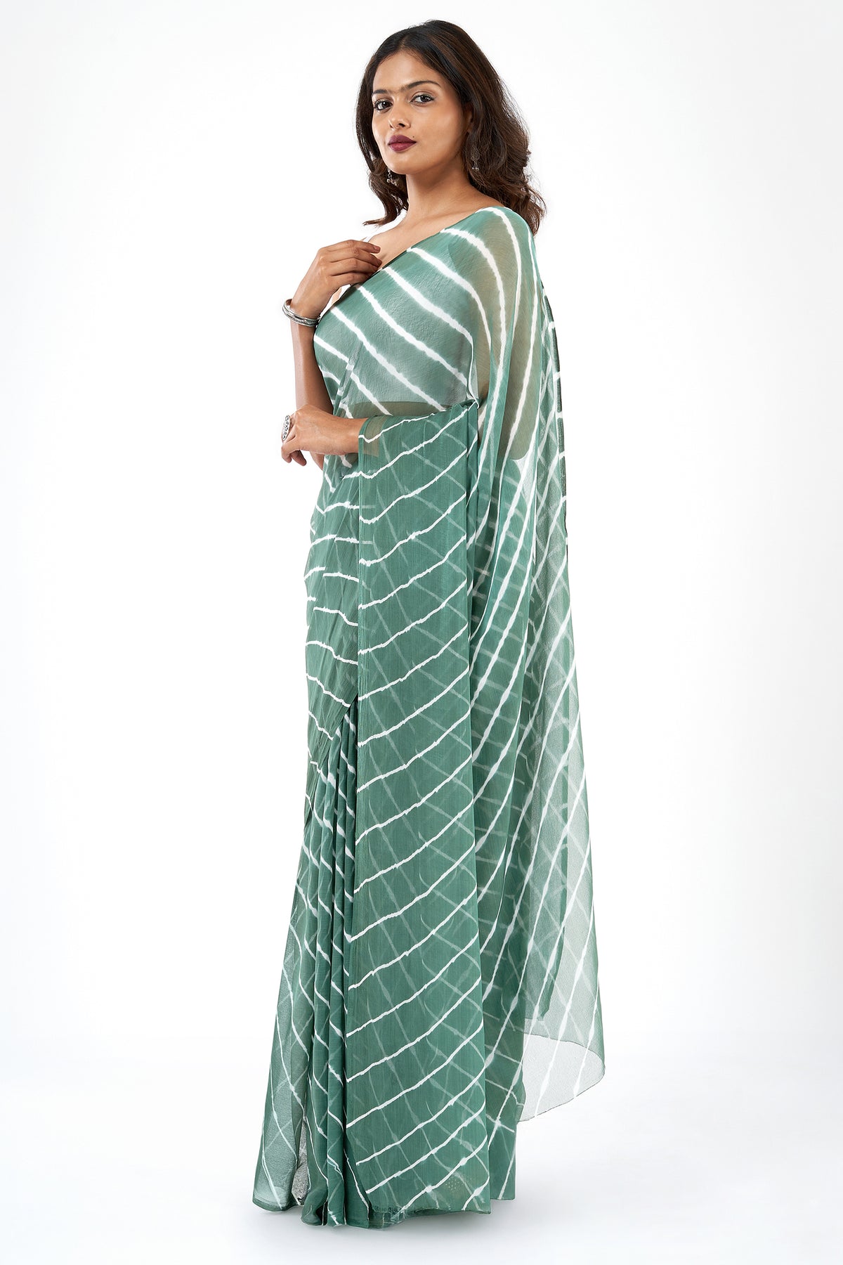 Evoking the lush beauty of monsoon, the Teejh Saawan Saree in dark green chiffon is light, breezy, and perfect for festive drapes. A celebration of tradition in every swirl.