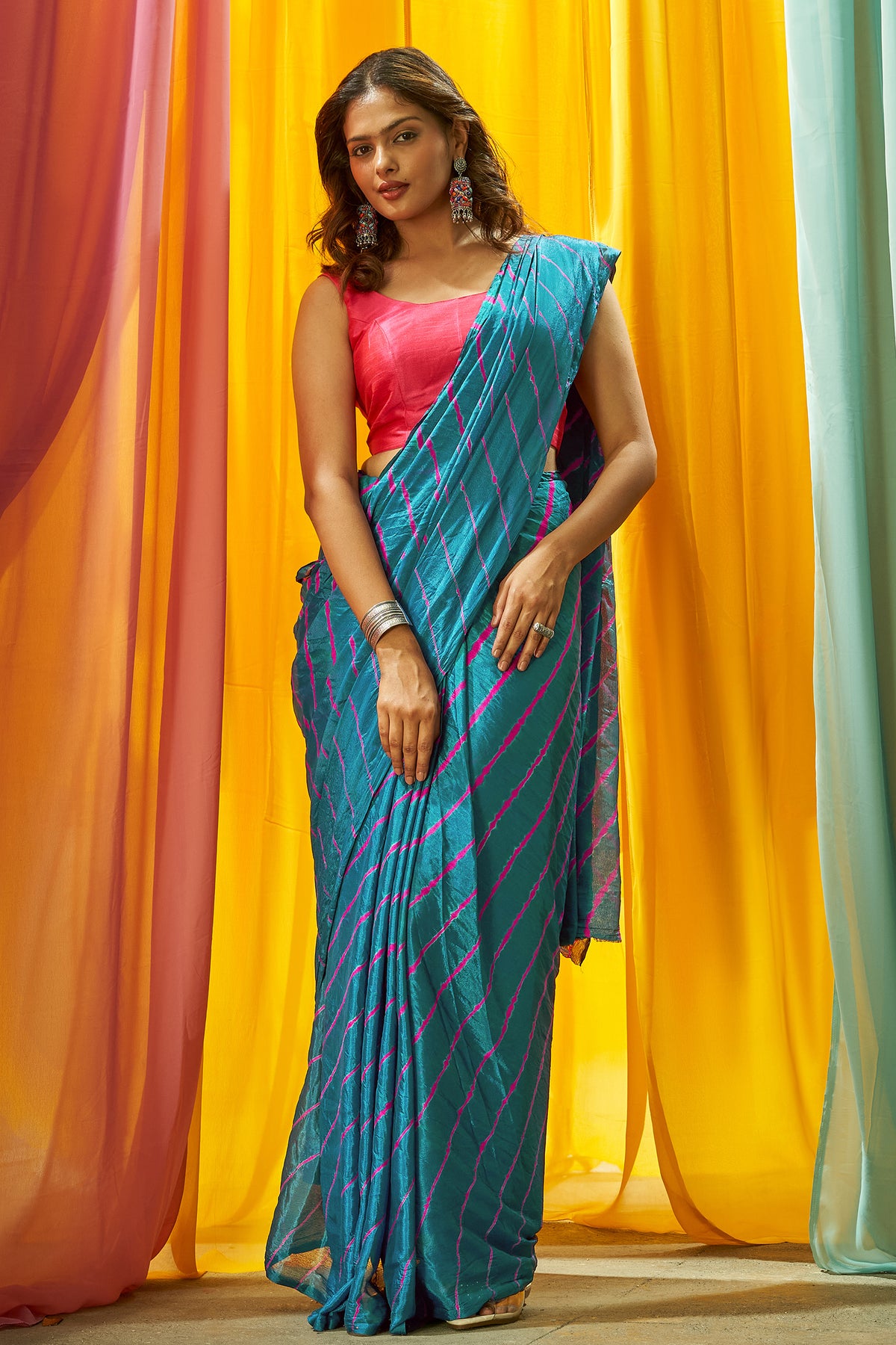 Fresh and quirky, the Teejh Sindhu Saree pairs turquoise and pink in a dreamy chinon drape. Great for pre-wedding events or festive fun.