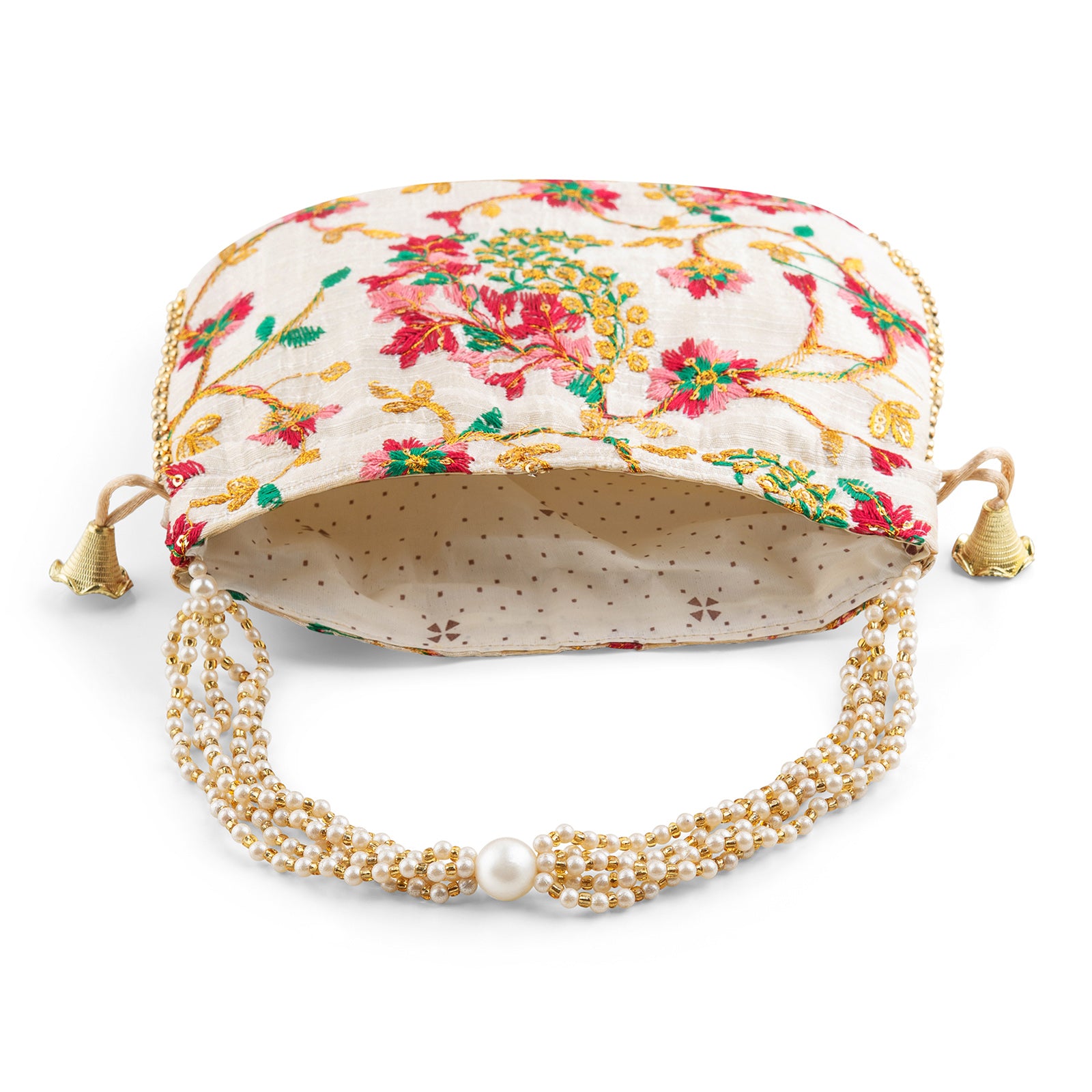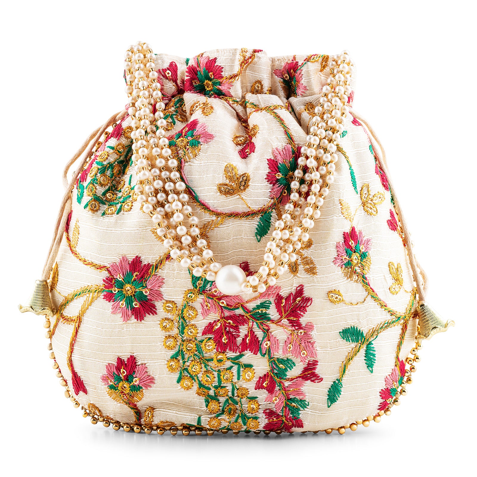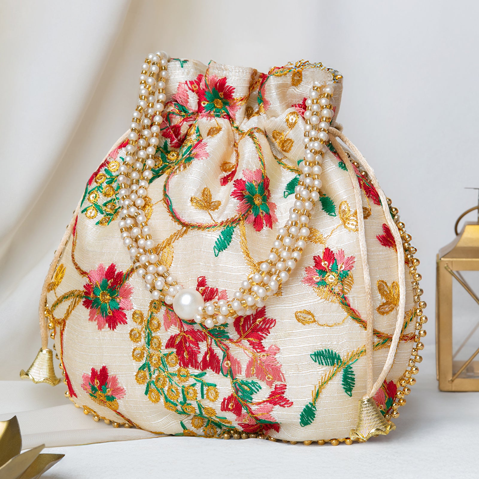 The Mausam Mastana Embroidered Cream Potli Bag is a masterpiece of grace and sophistication. Its exquisite embroidery and shimmering silver hue make it a perfect accessory for your ethnic wardrobe