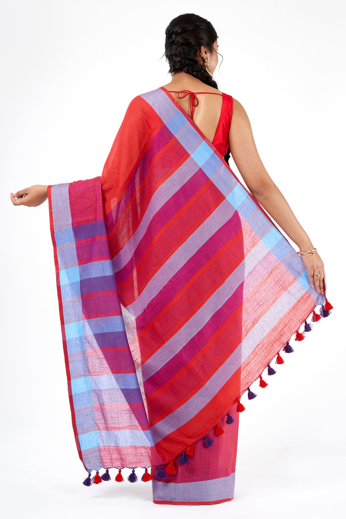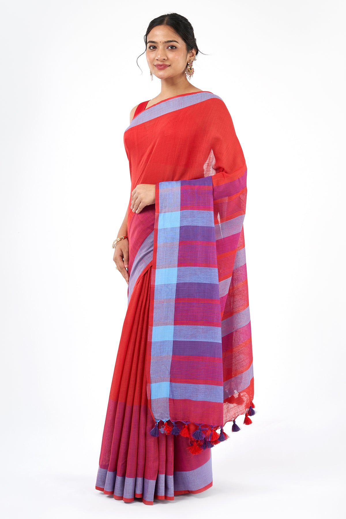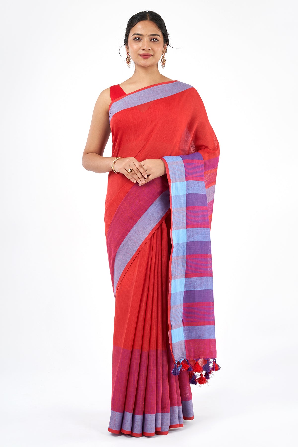 Bold meets balance in Sarang, with deep red and cool blue flowing in striking contrast. This cotton blend saree offers a contemporary twist on tradition—perfect for those who love statement pieces with clean lines.