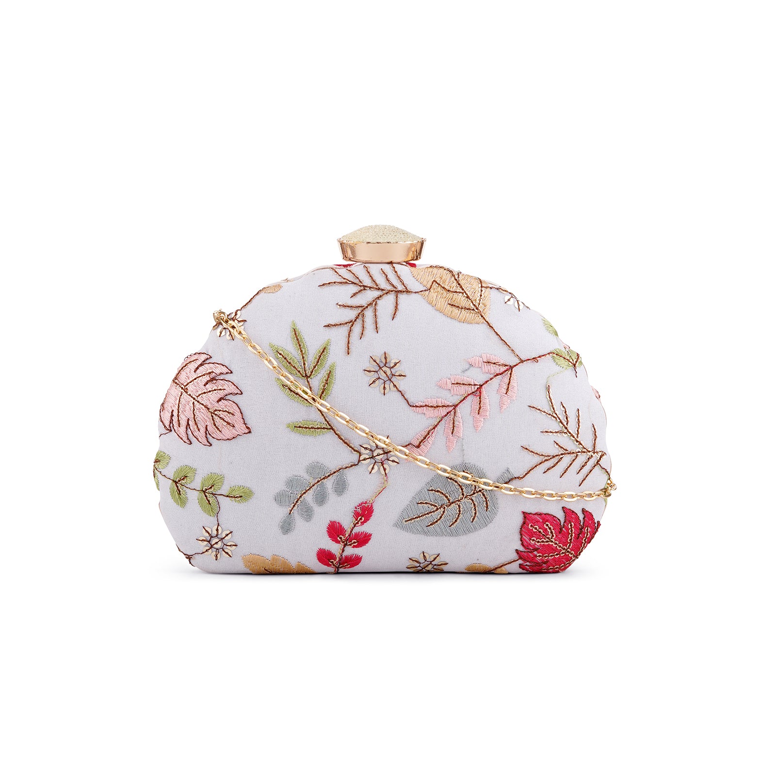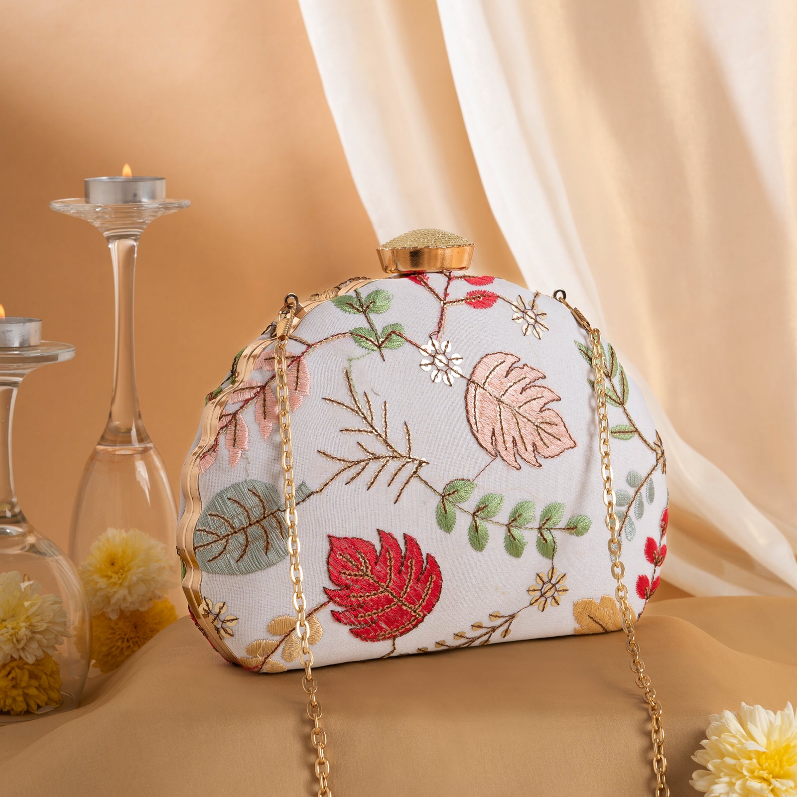 Delight in the refined charm of the Teejh Shaheen Threadwork Clutch. The soft vanilla white fabric, adorned with luxurious gold and pink threadwork, creates a sophisticated accessory ideal for special occasions.