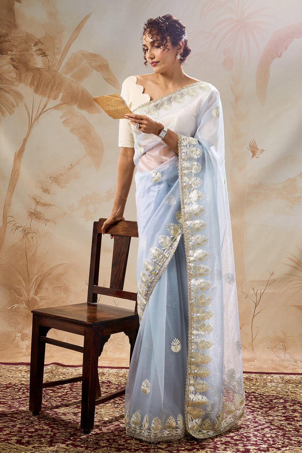 Step into the wedding season with grace in the Teejh Baani Organza Gota Saree. Featuring exquisite gota embroidery on lightweight organza, this saree is a versatile pick for pre-wedding rituals or festive occasions. Tradition meets sophistication in every drape.