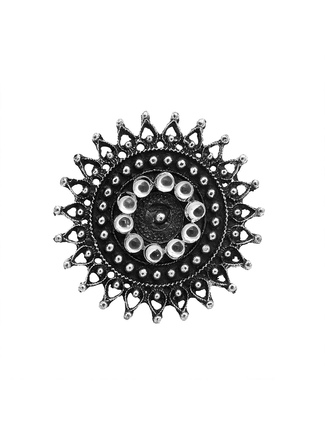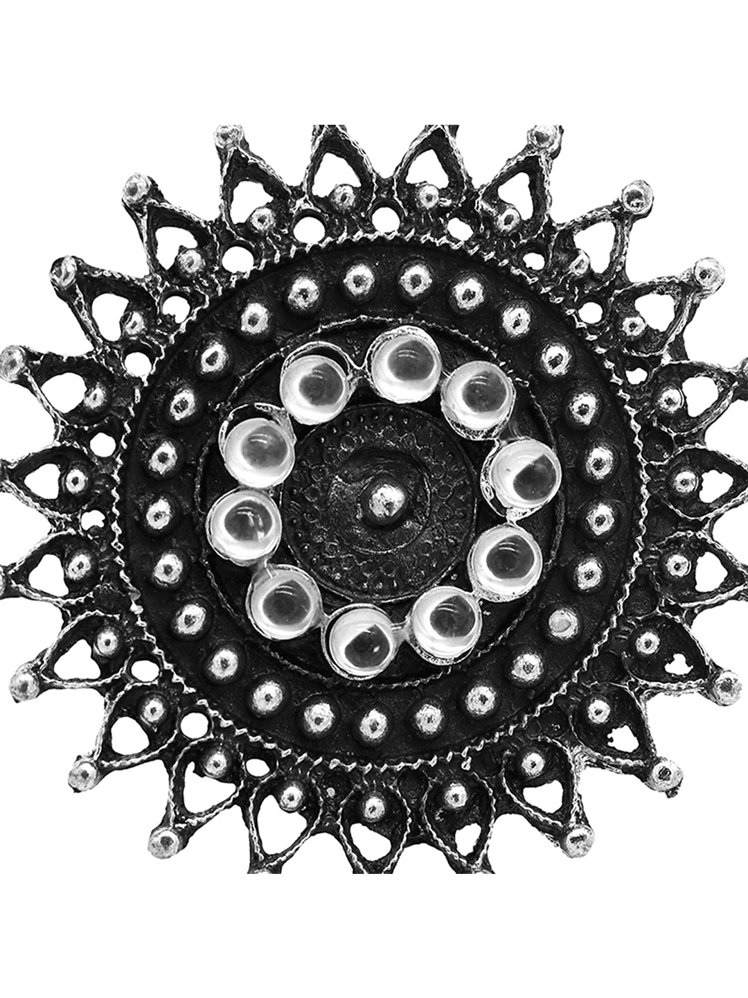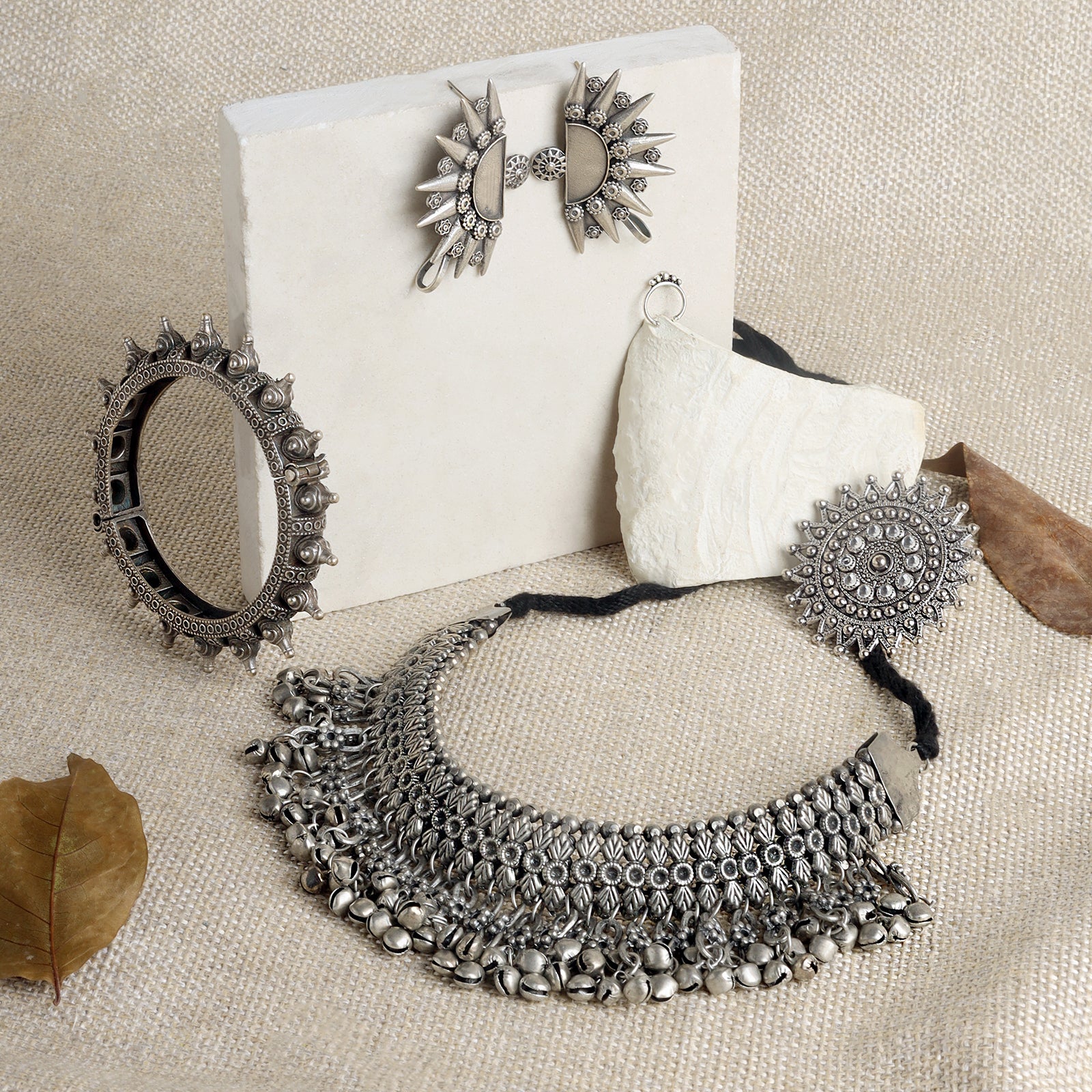 Dazzle in our Teejh Avanti Oxidised Silver Jewellery Gift Set, a fusion of bohemian charm and elegance. The intricate patterns and dark allure make it a must-have. Wear it with a linen ensemble for a chic, contrasting look that exudes effortless sophistication.