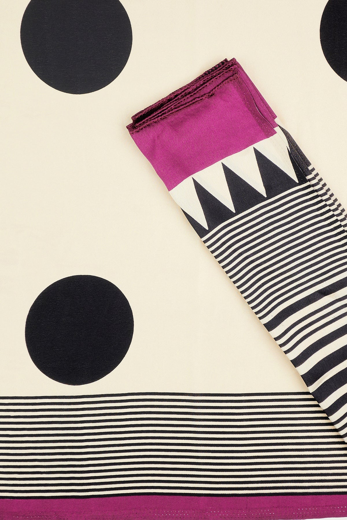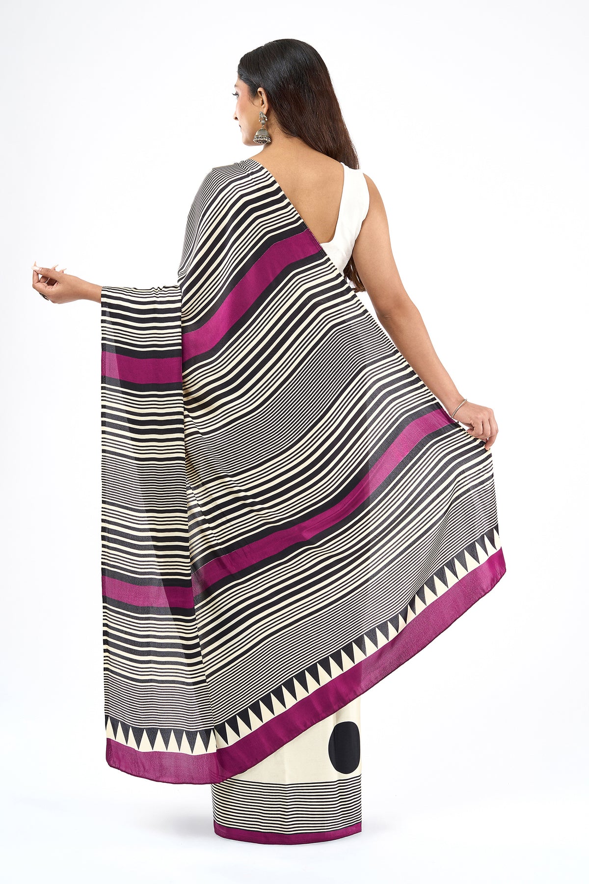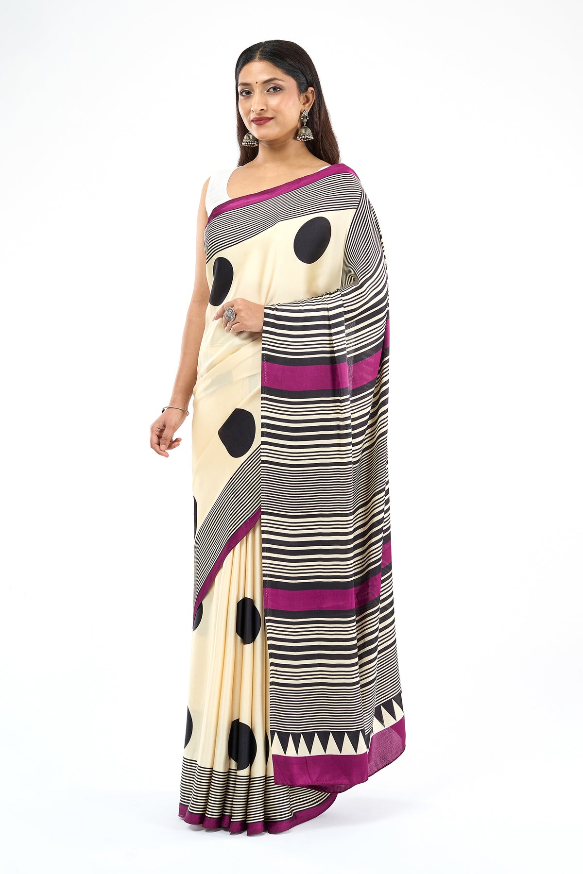The Teejh Afrina Saree makes a vibrant splash with magenta accents, balanced by cream and black. The perfect mix of art and attitude.