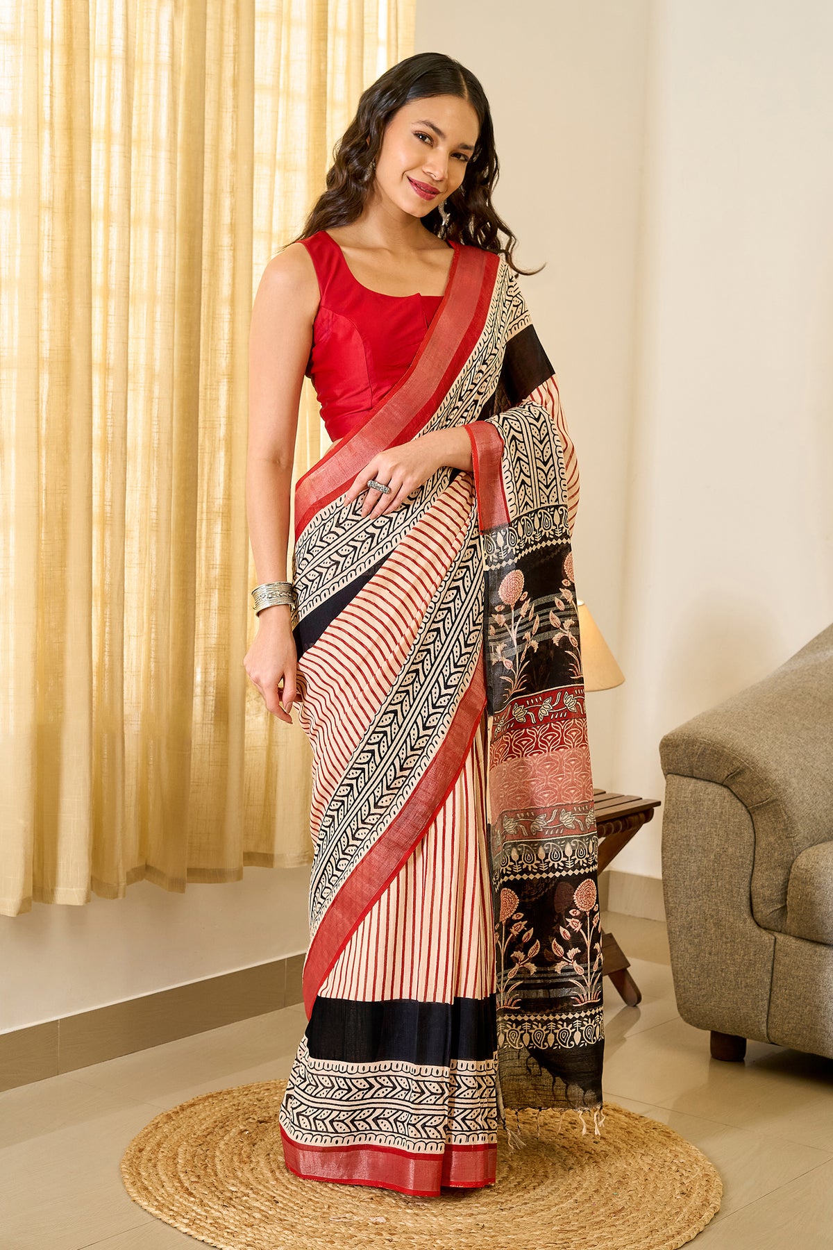 Crafted in luxe linen with a subtle sheen, this saree is your new go-to for brunches, meetings, and everything in between.