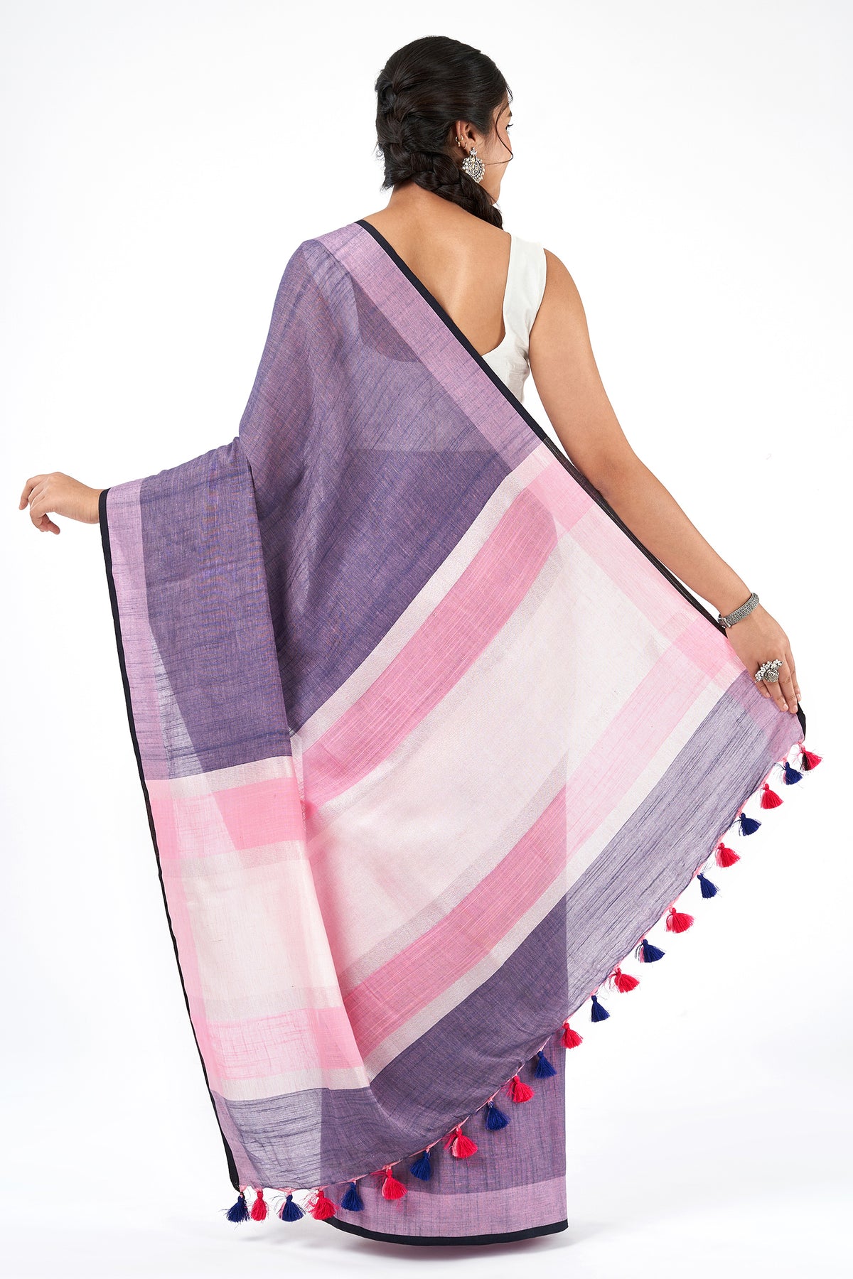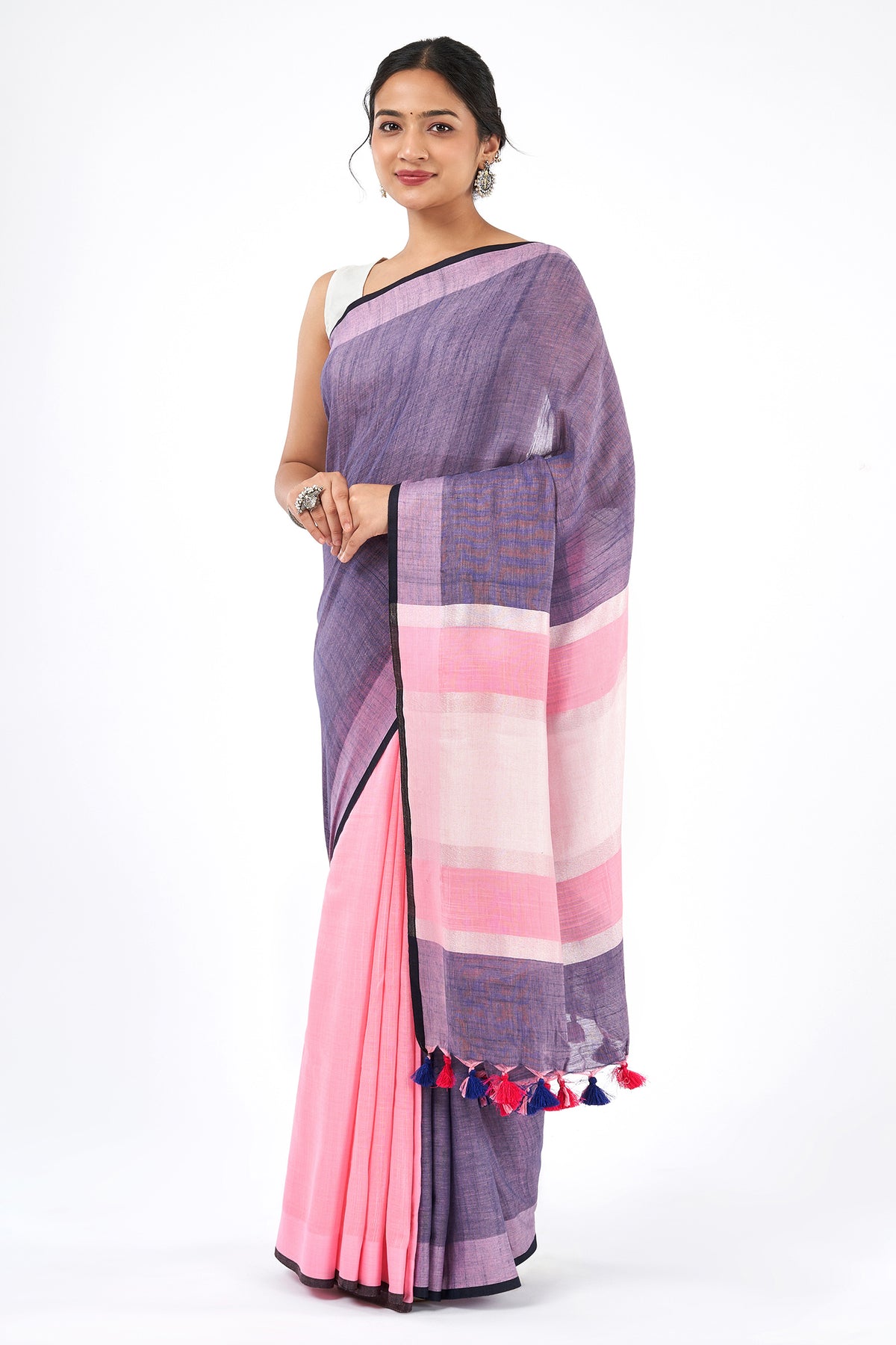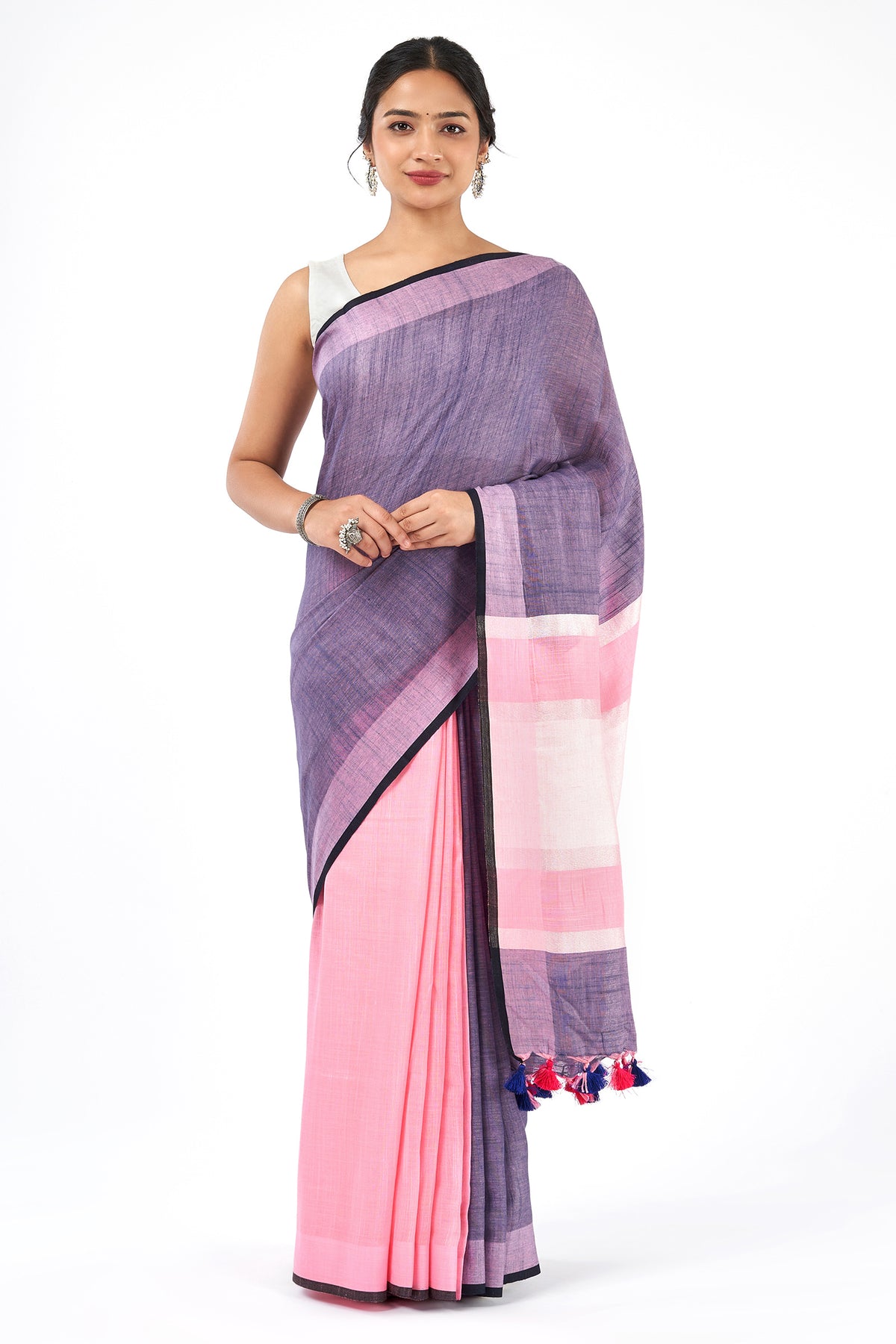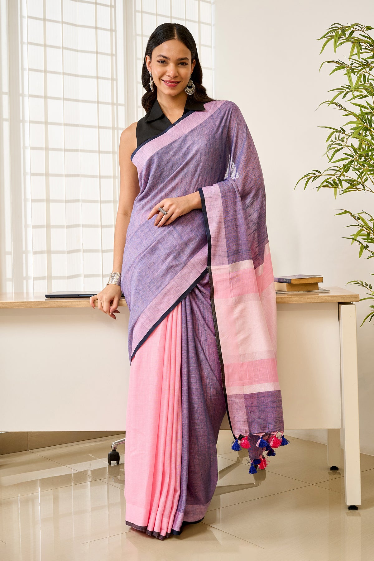 A harmony of soft hues, the Teejh Serene Split Saree brings together blush pink and muted blue in a contemporary colourblock design. Woven in a cotton blend fabric that feels as good as it looks, this saree is all about subtle sophistication. Ideal for workdays or casual outings.