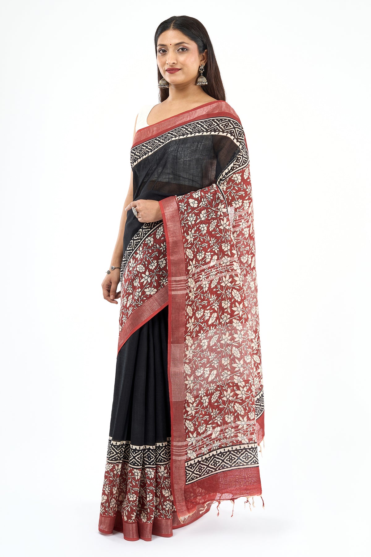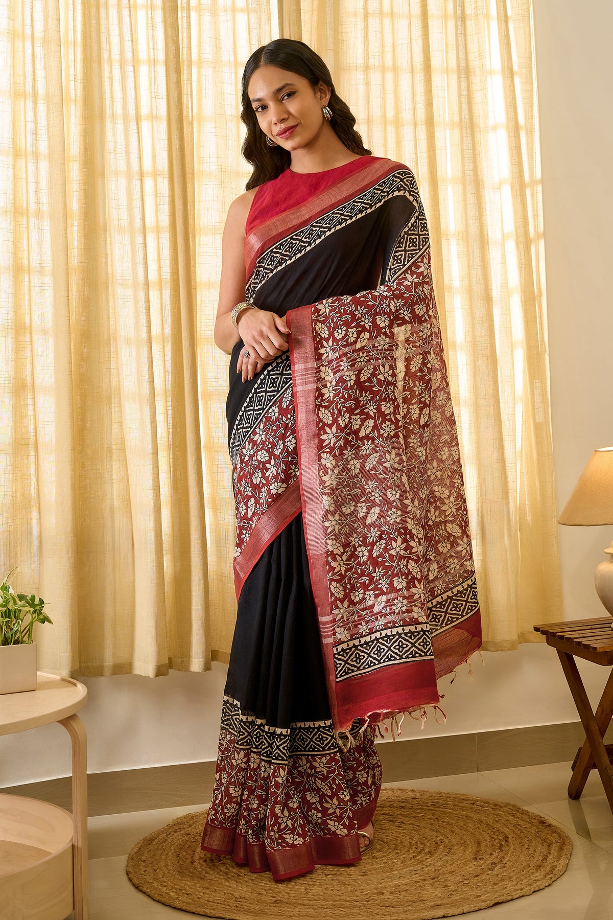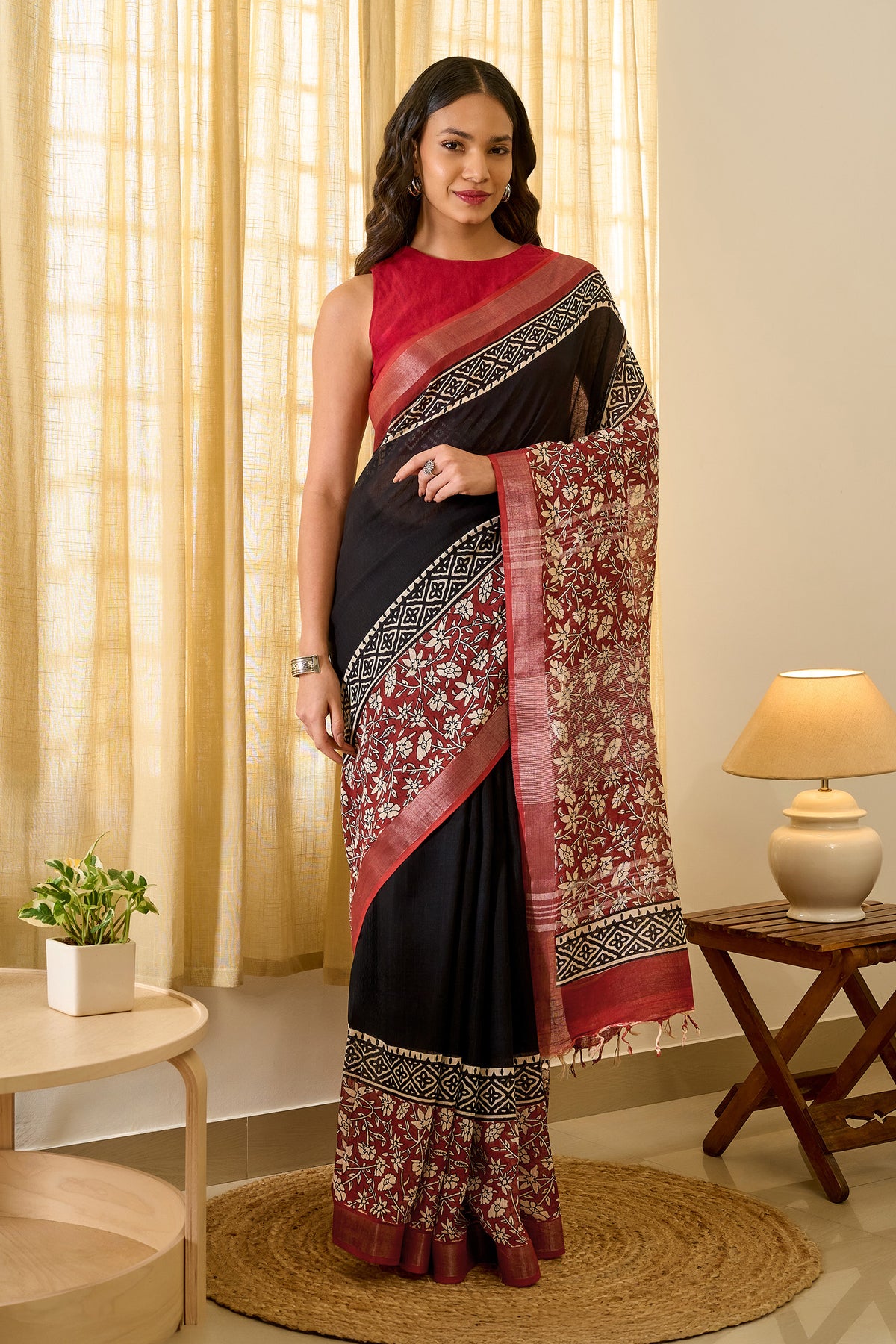 Teejh Sharika Black & Red Hand Blockprint Saree