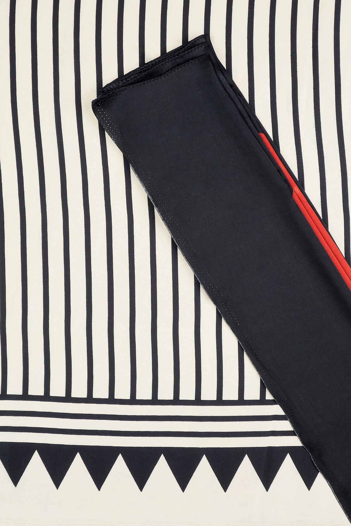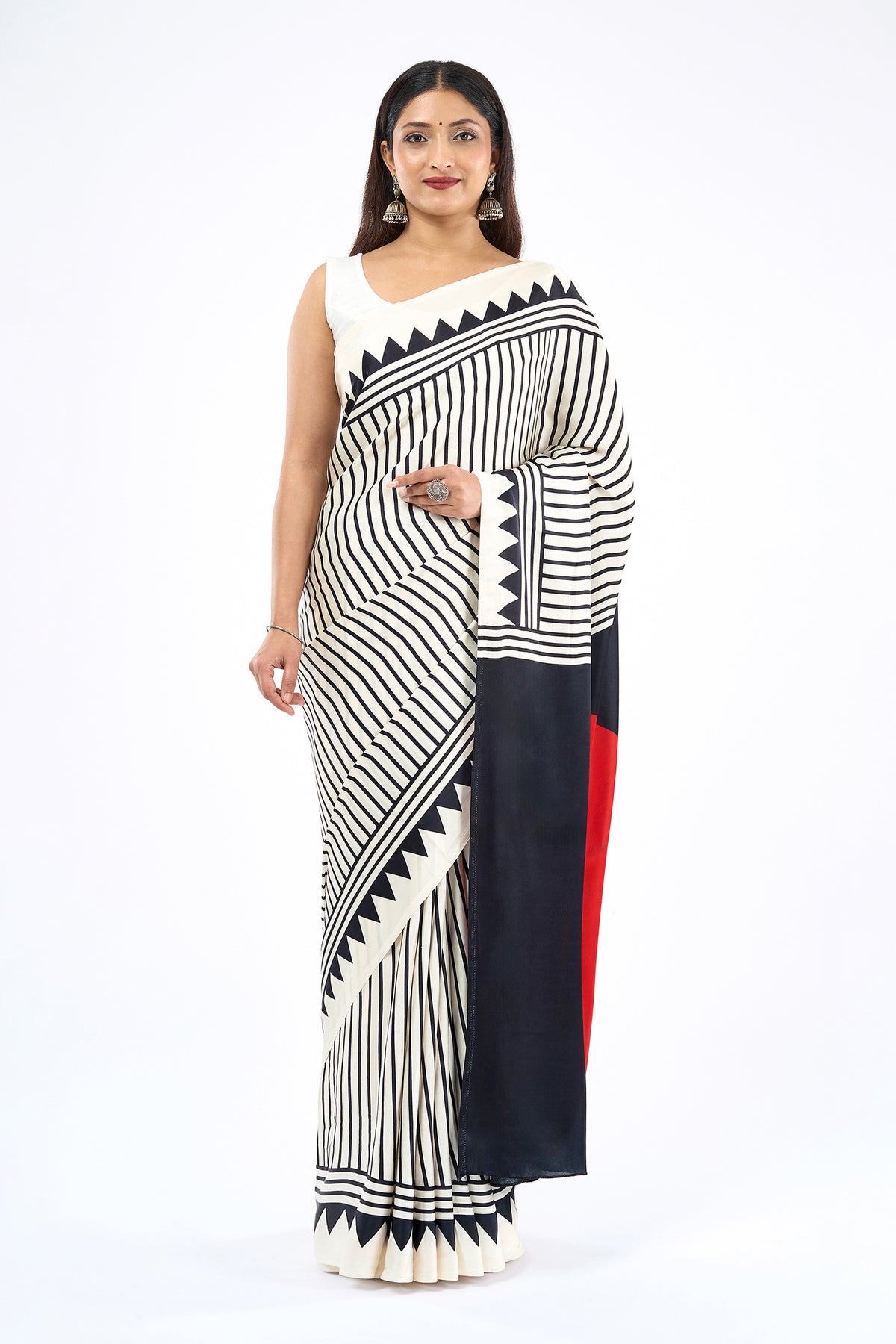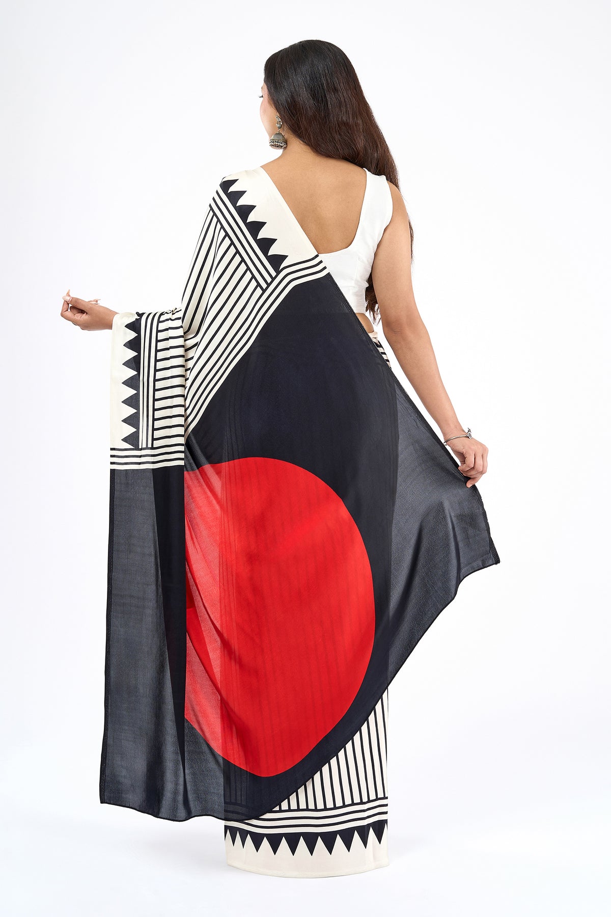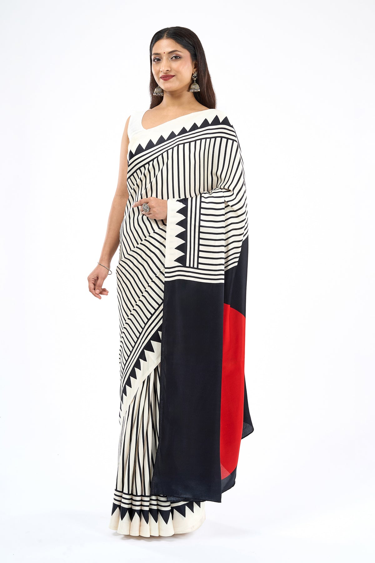 Playful and edgy, the Teejh Zafna Saree brings together cream, black, and red in a stunning digital print — a perfect mix of tradition and boldness.