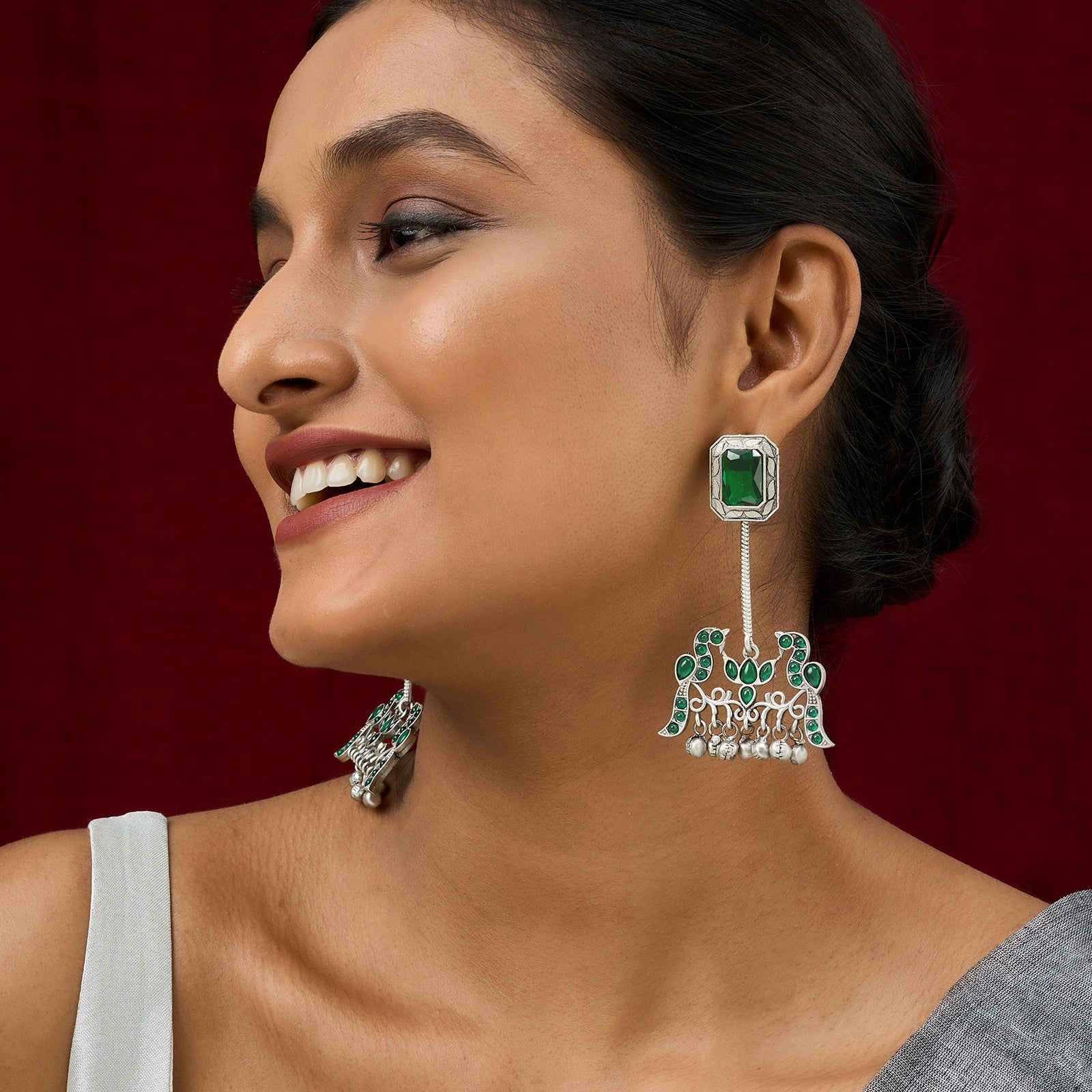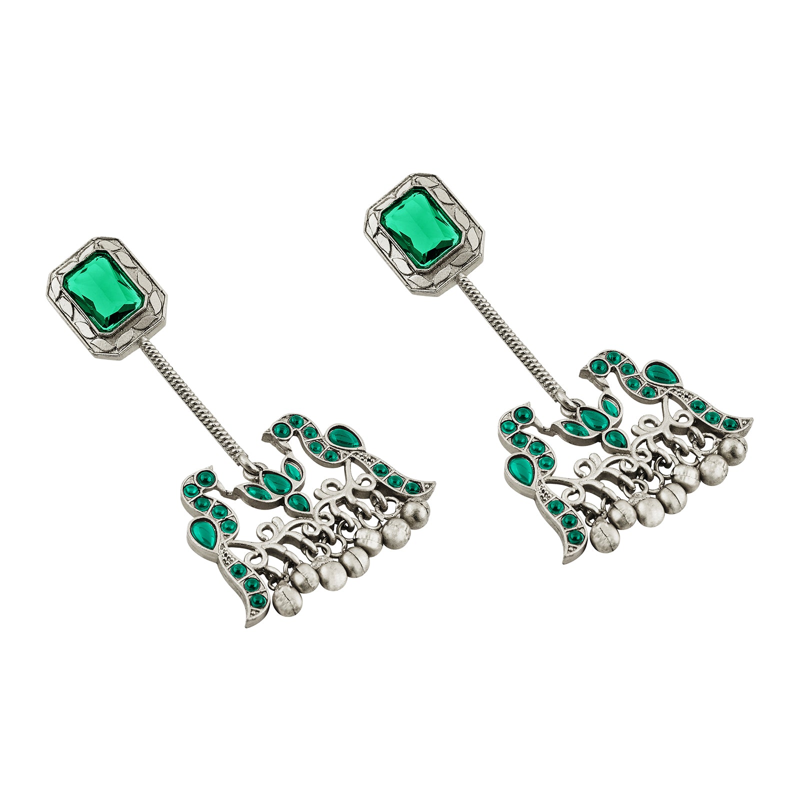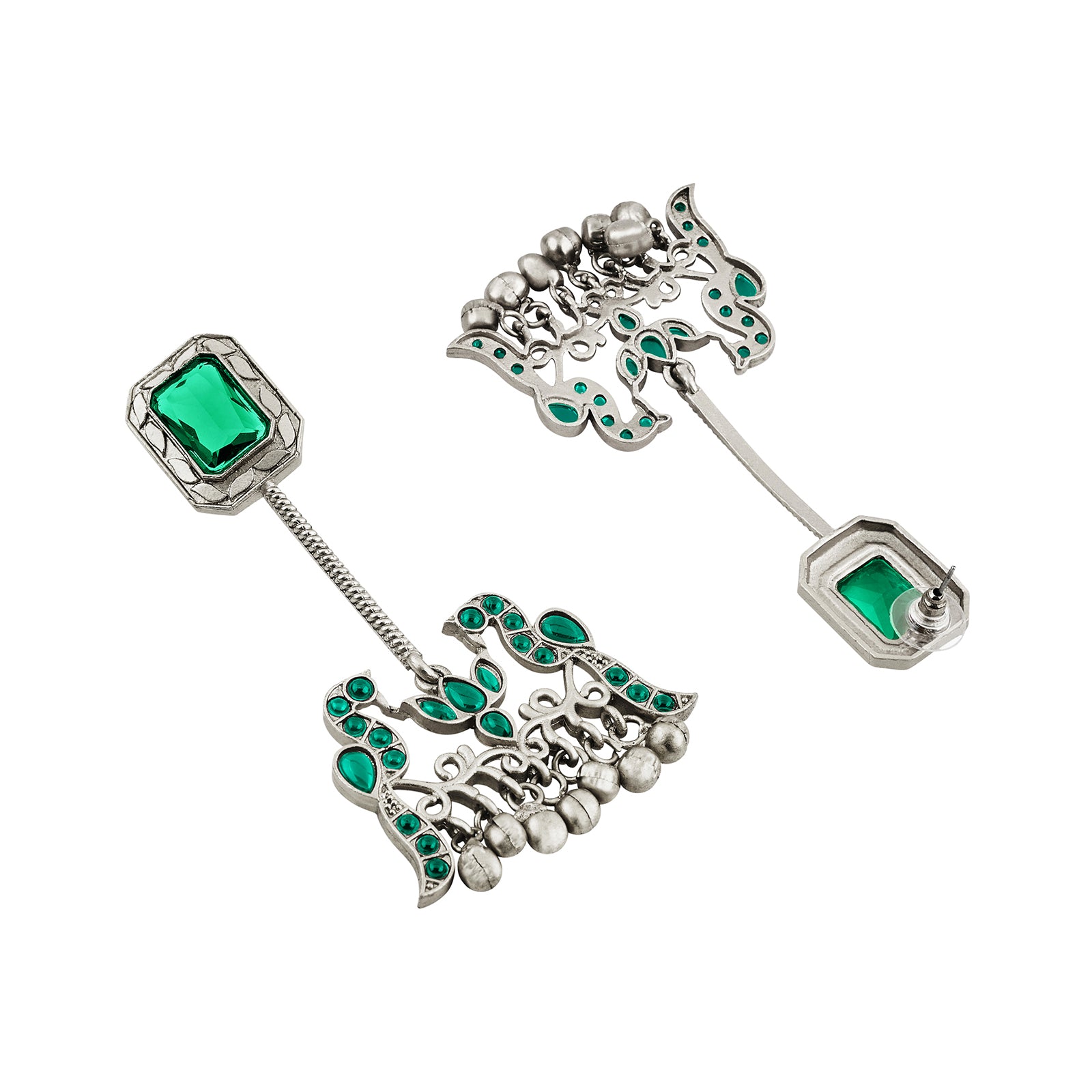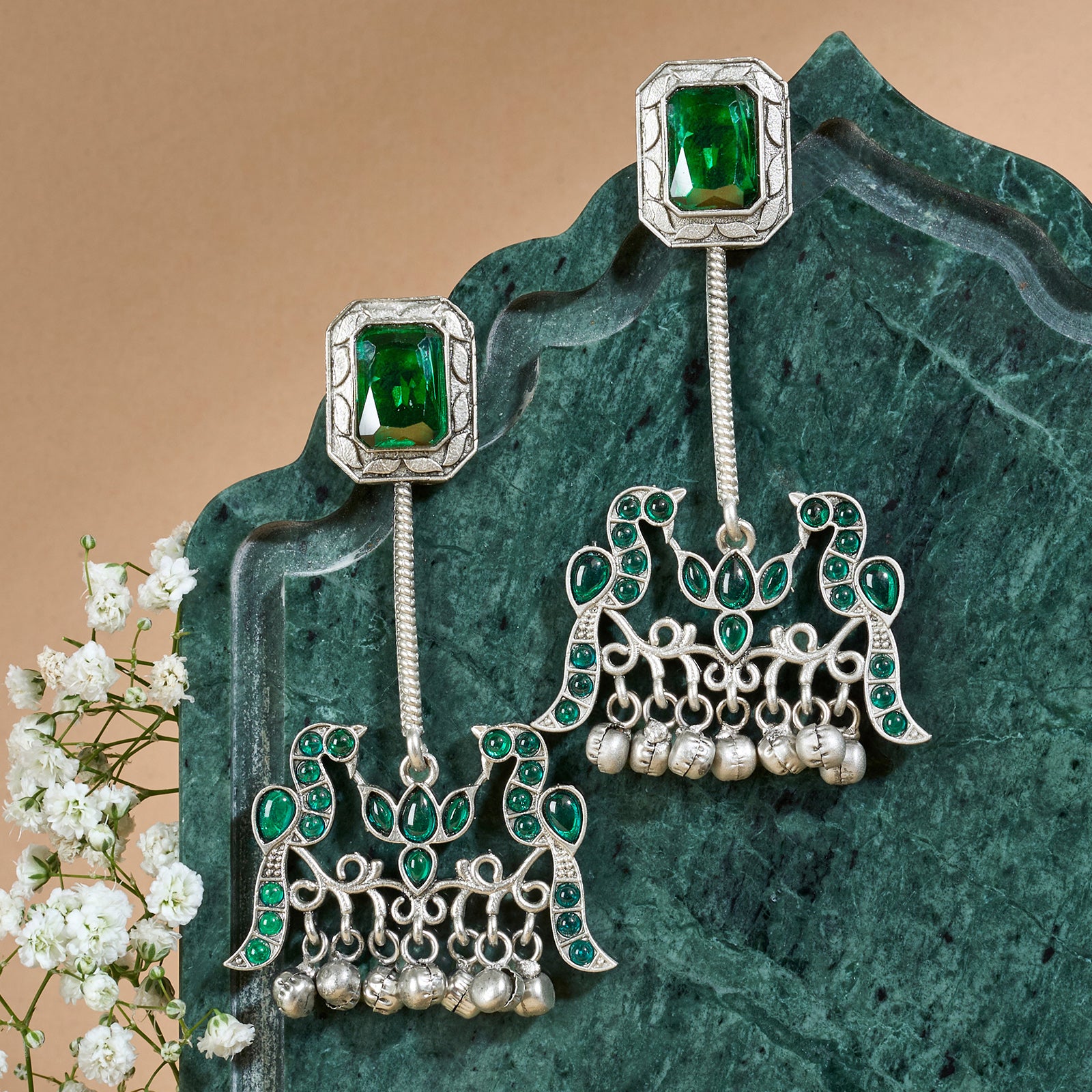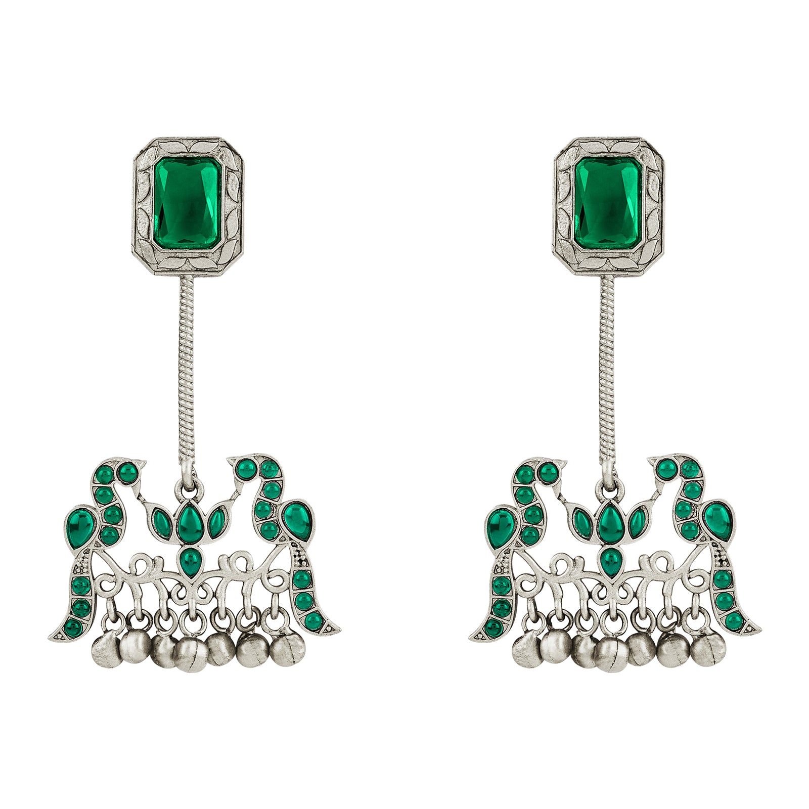 Teejh Diha Silver and Green Stones Jhumka