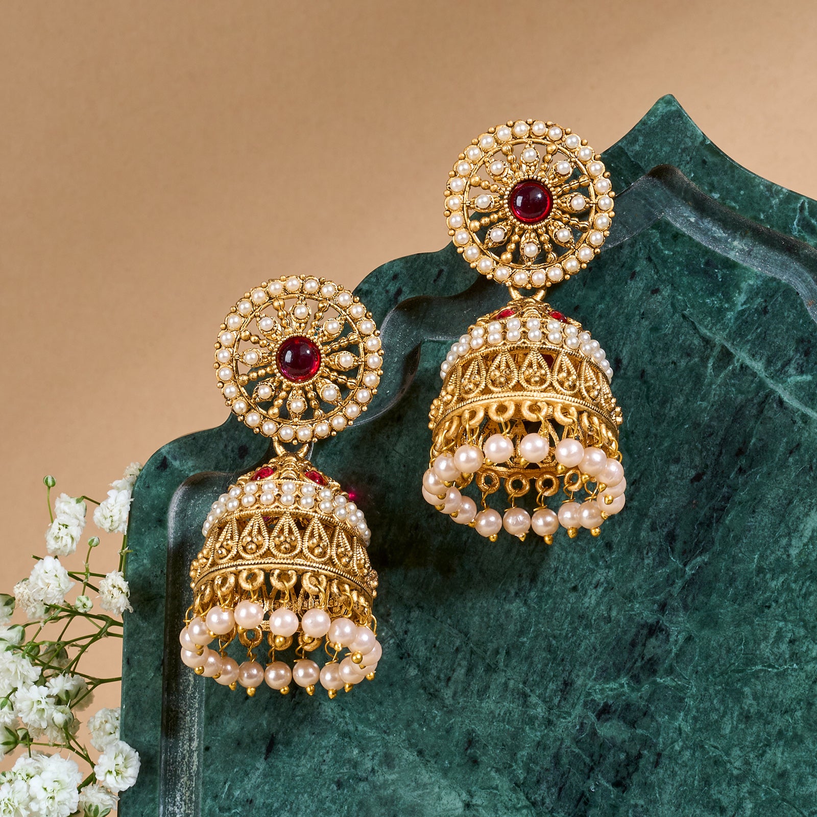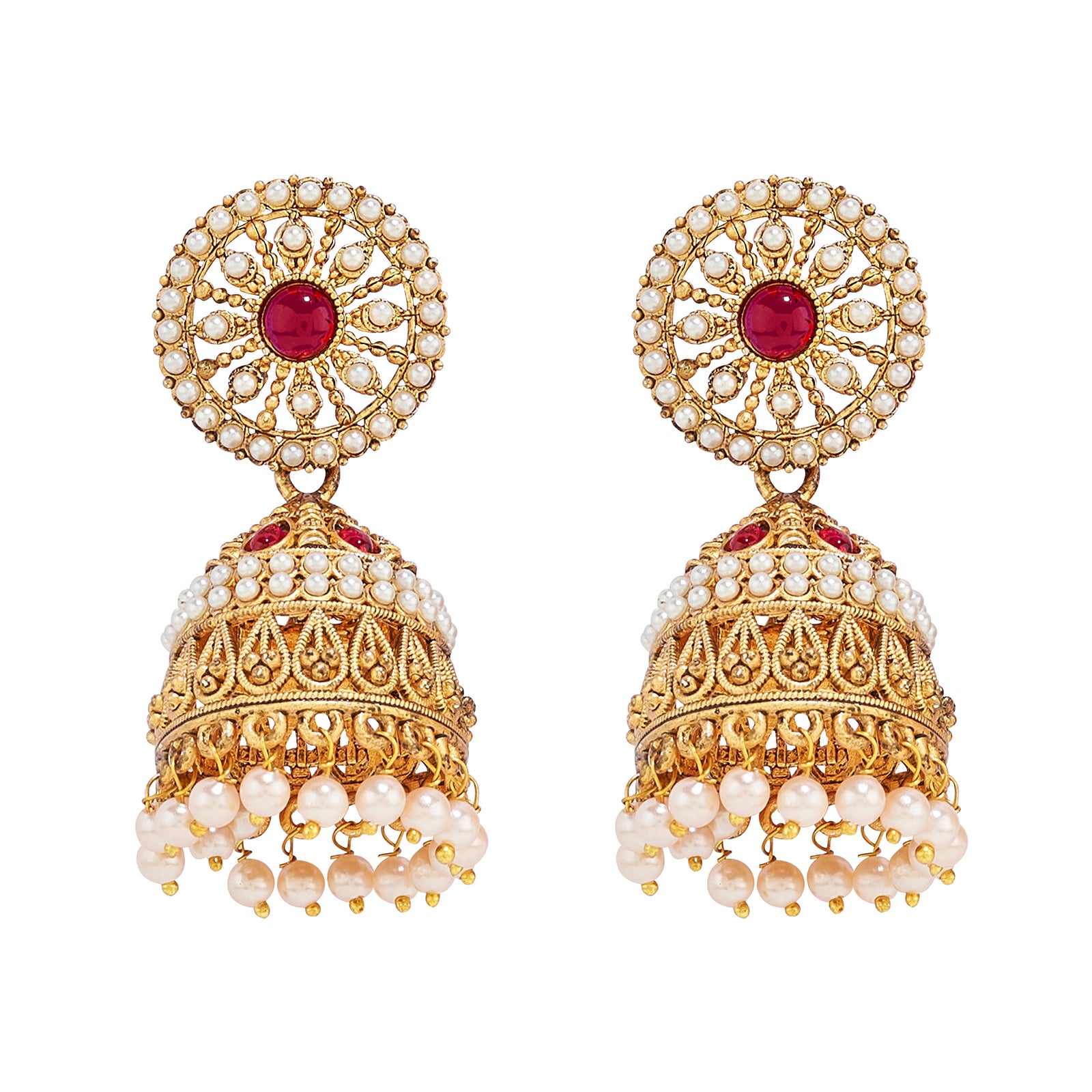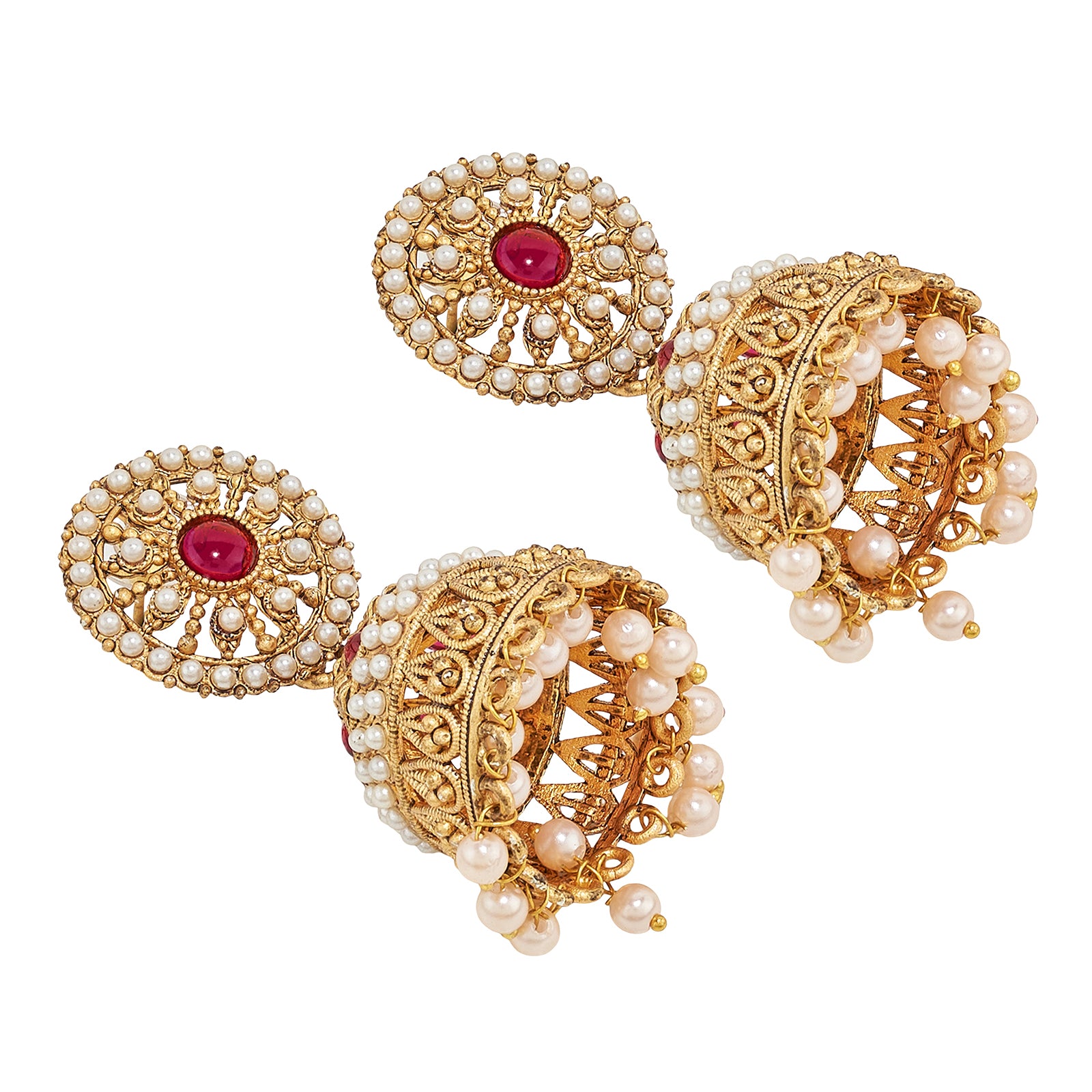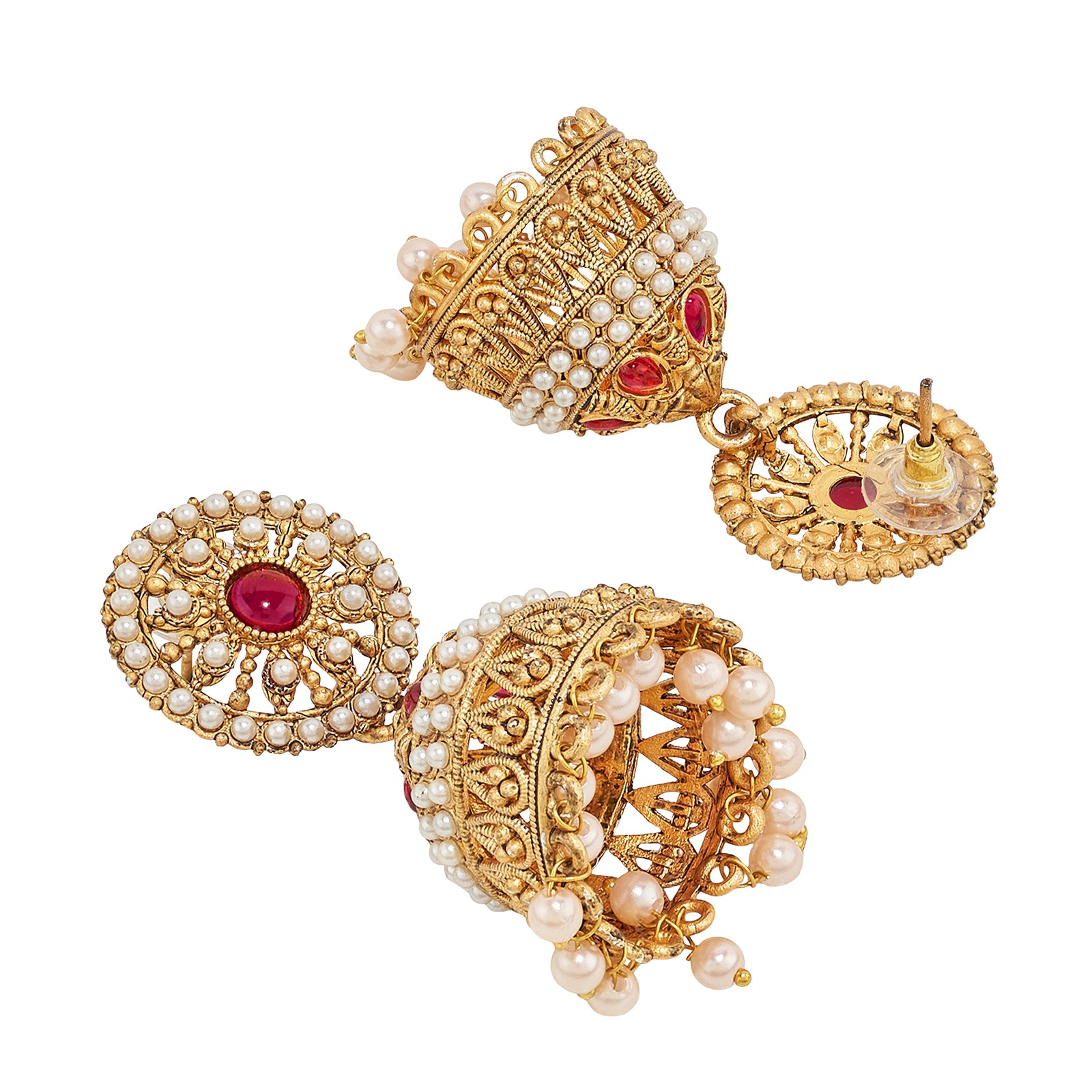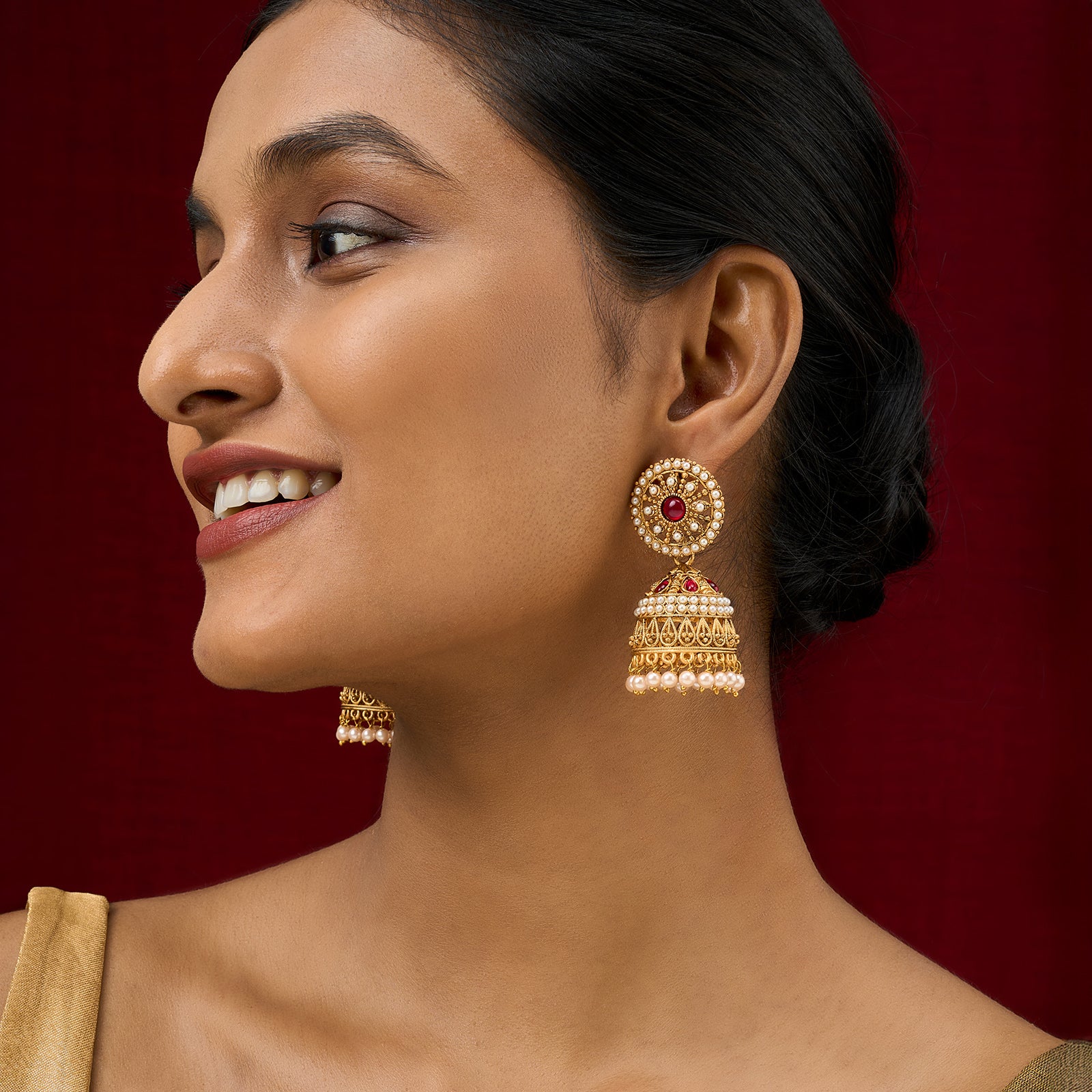 Traditional gold meets bold red in this festive jhumka. A classic design reimagined for the modern muse. It’s basically Diwali, weddings, and shaadi-season in one pair.