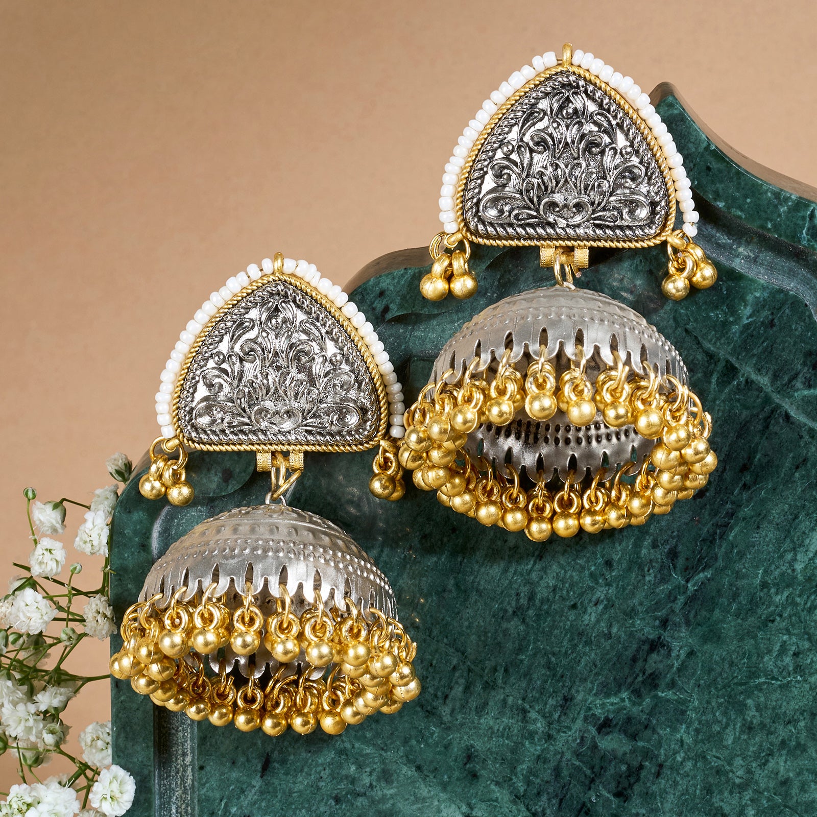 This semi-Indian heavy pair of earrings is where intricate craftsmanship meets contemporary flair. Rich detailing in oxidized silver or antique gold tones makes it perfect for Indo-western ensembles.