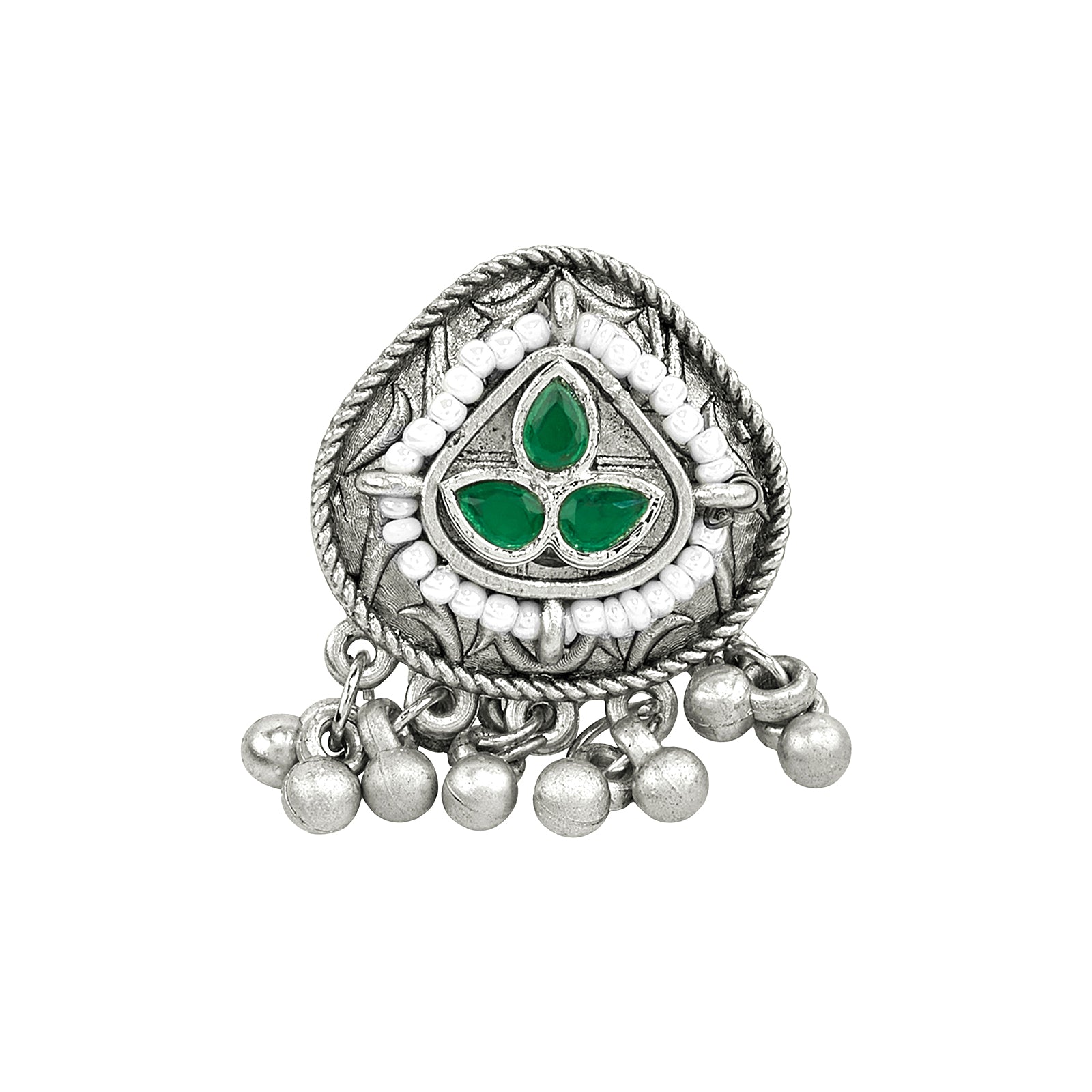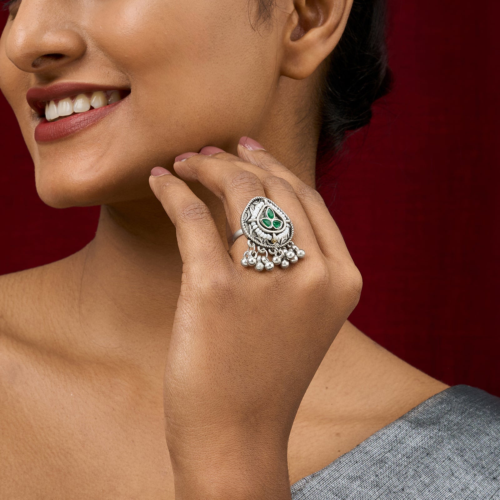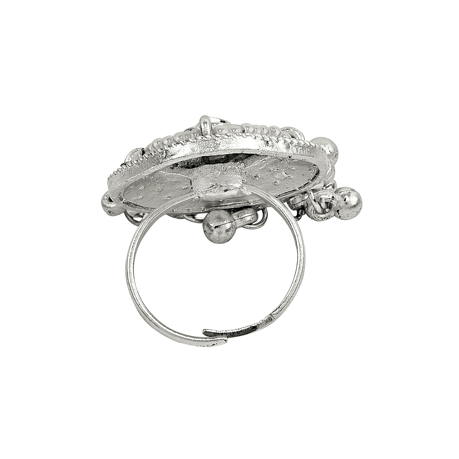 This statement ring blends intricate Indian motifs with sleek metal finishes. Perfect to pair with ethnic wear or as a bold accessory for your contemporary outfits.