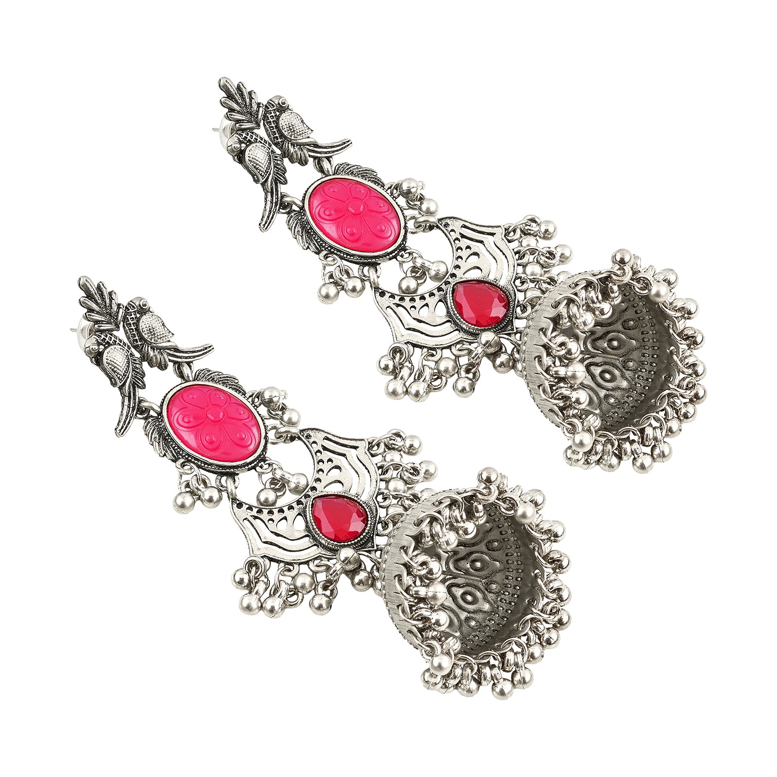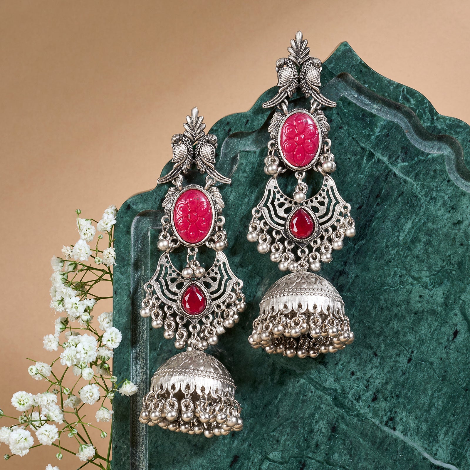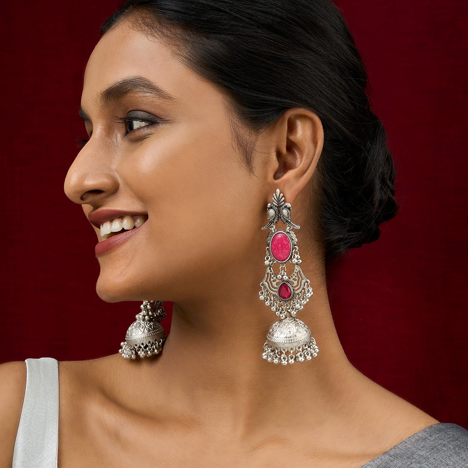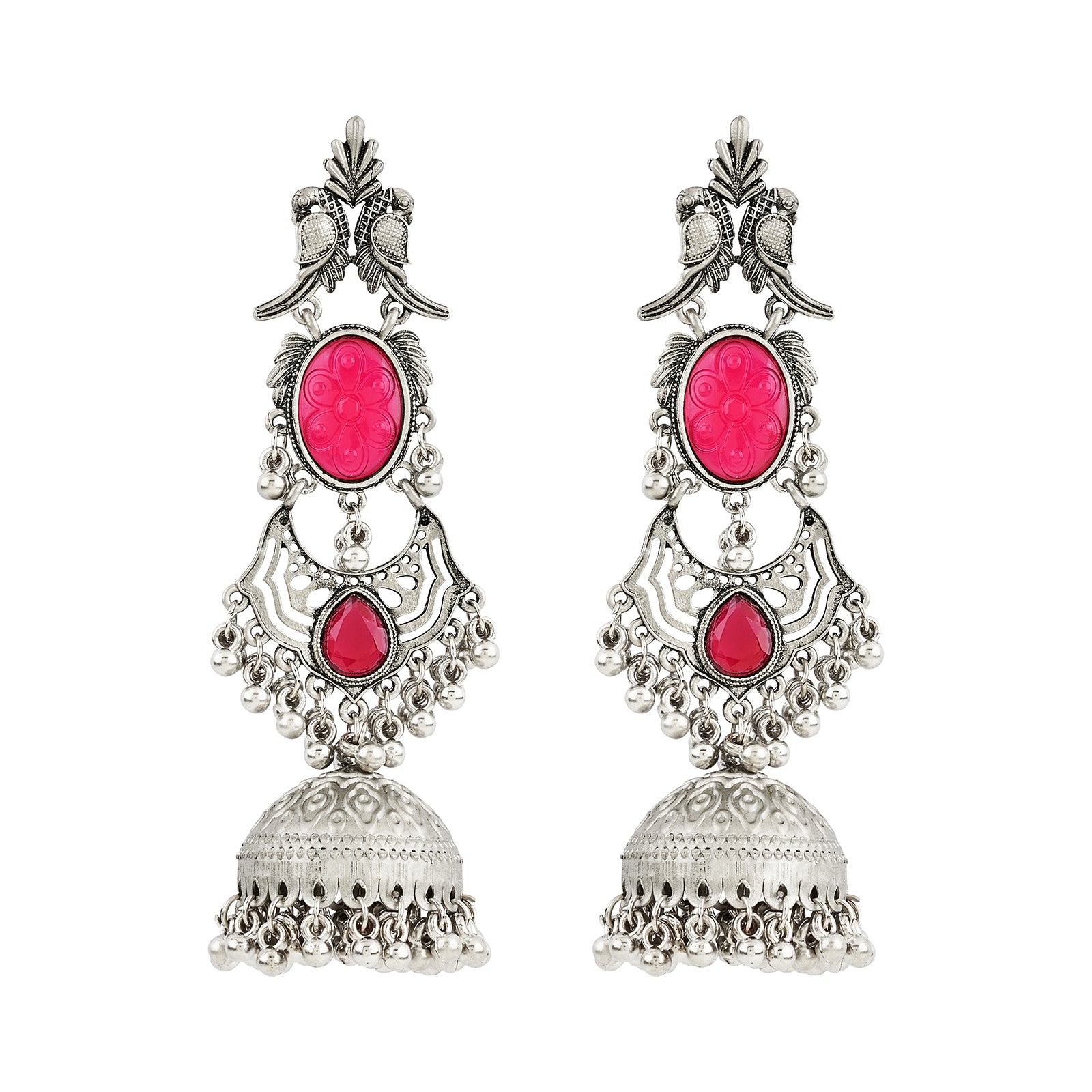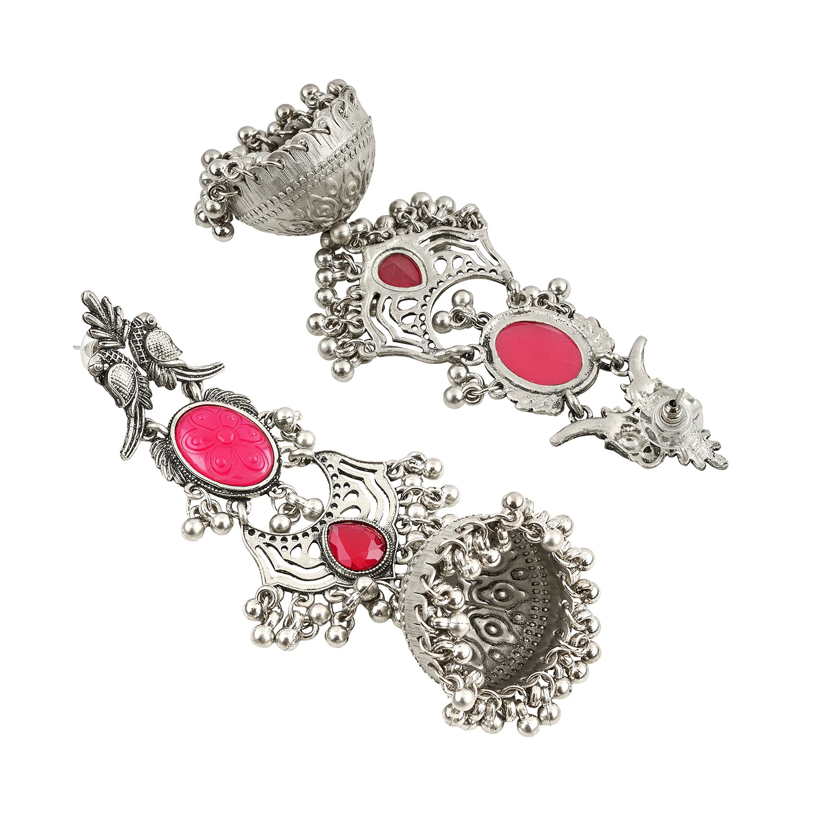 Teejh Shanka Silver and Red Stones Jhumkas