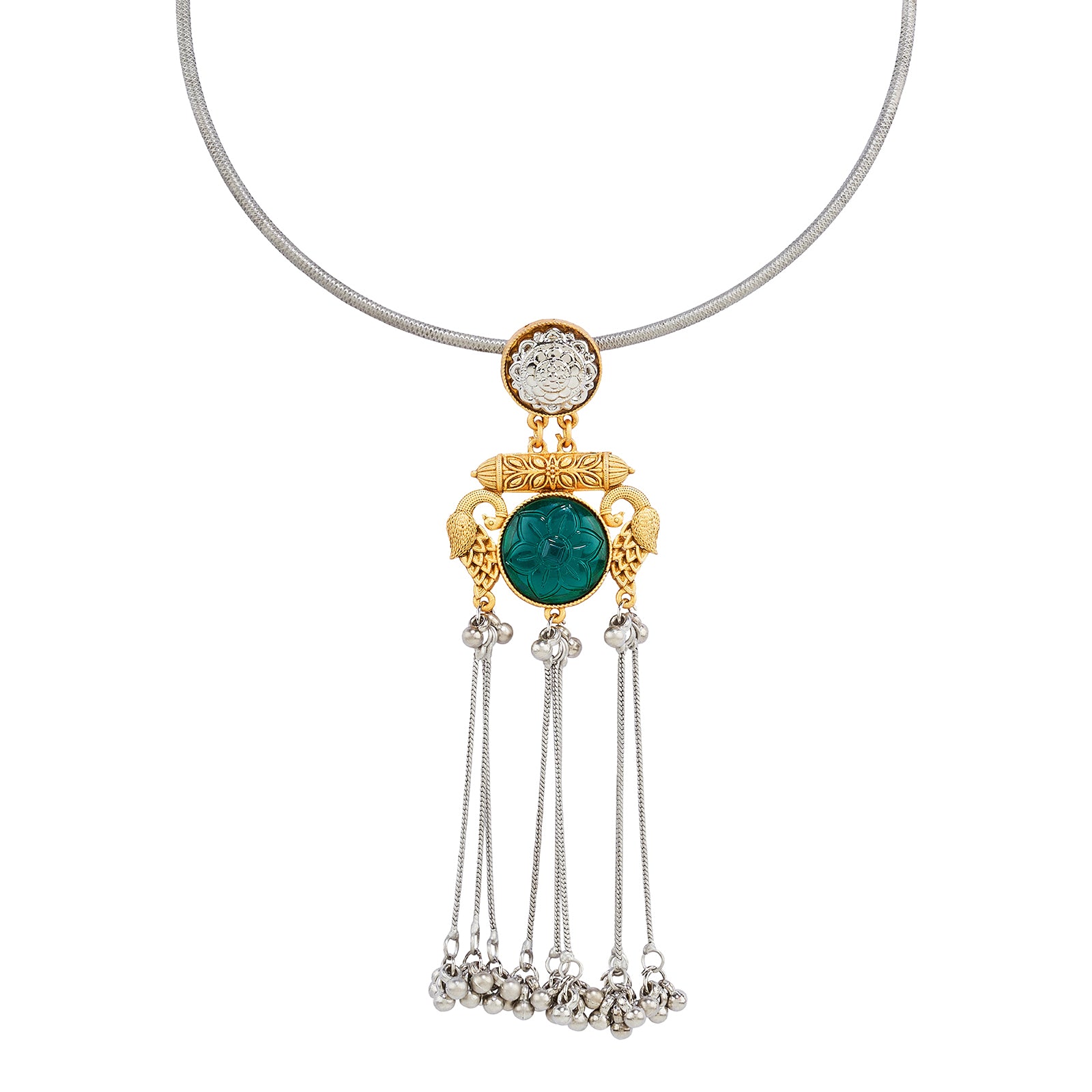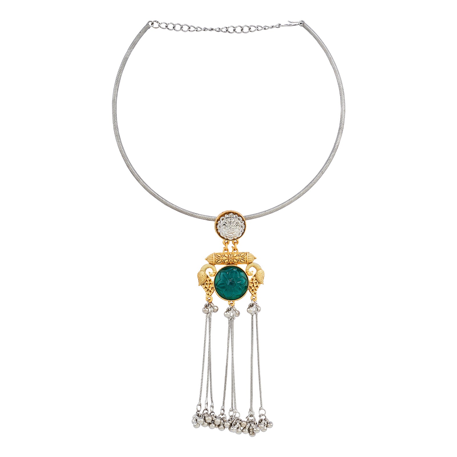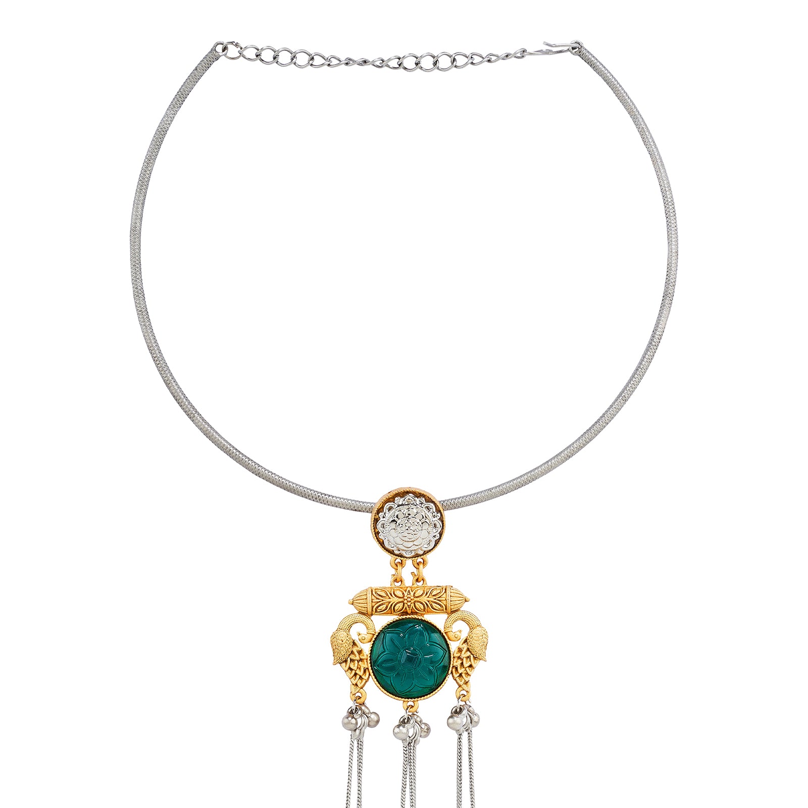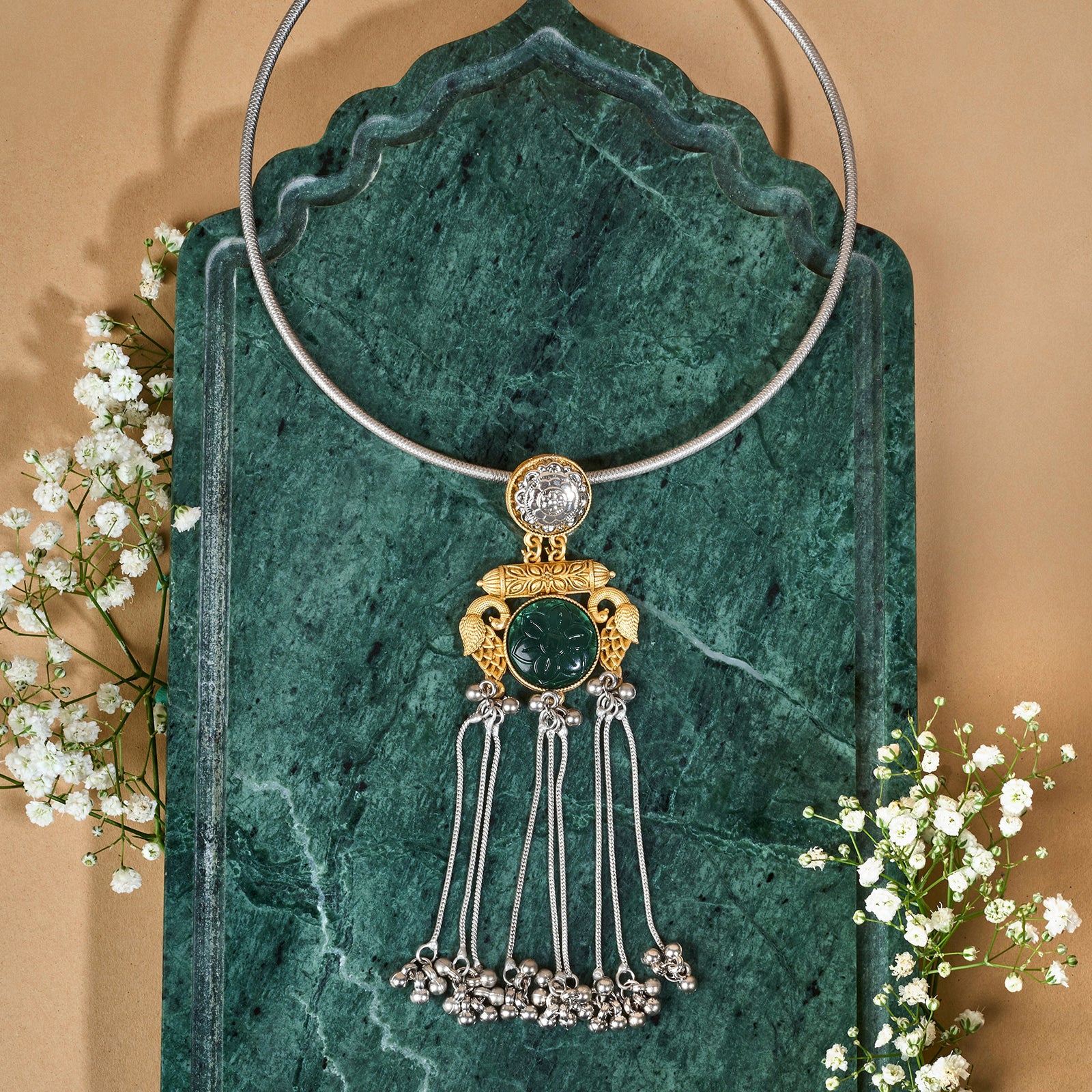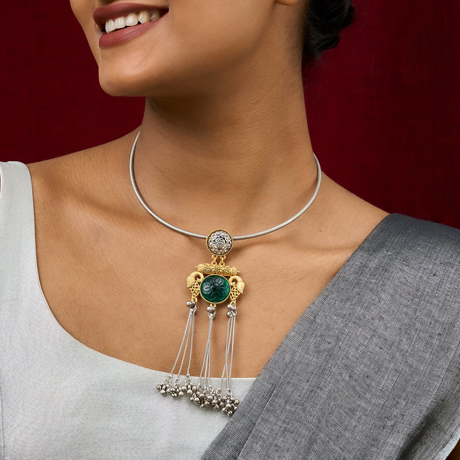 This Tari semi-Indian heavy necklace is where intricate craftsmanship meets contemporary flair. Rich detailing in oxidized silver or antique gold tones makes it perfect for modern sarees or Indo-western ensembles.