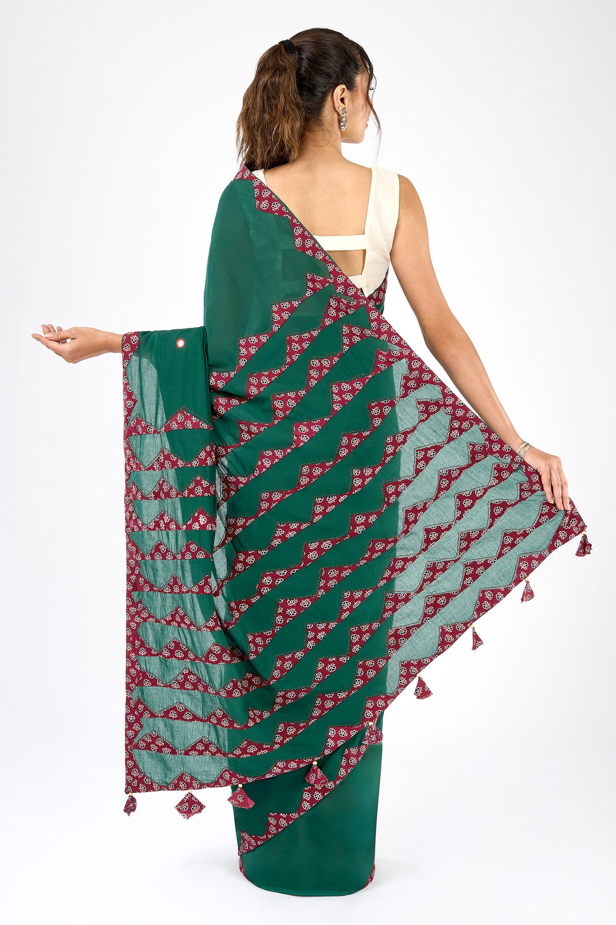 Chayana Deep Green & Red Applique & Mirror Work Saree