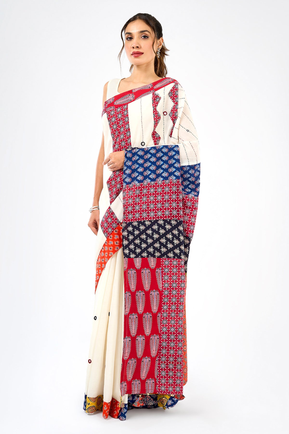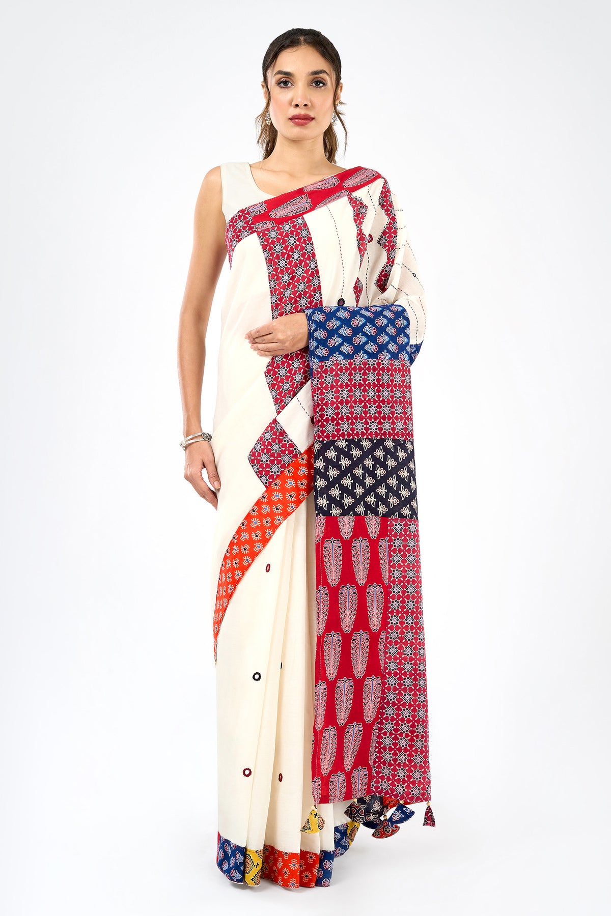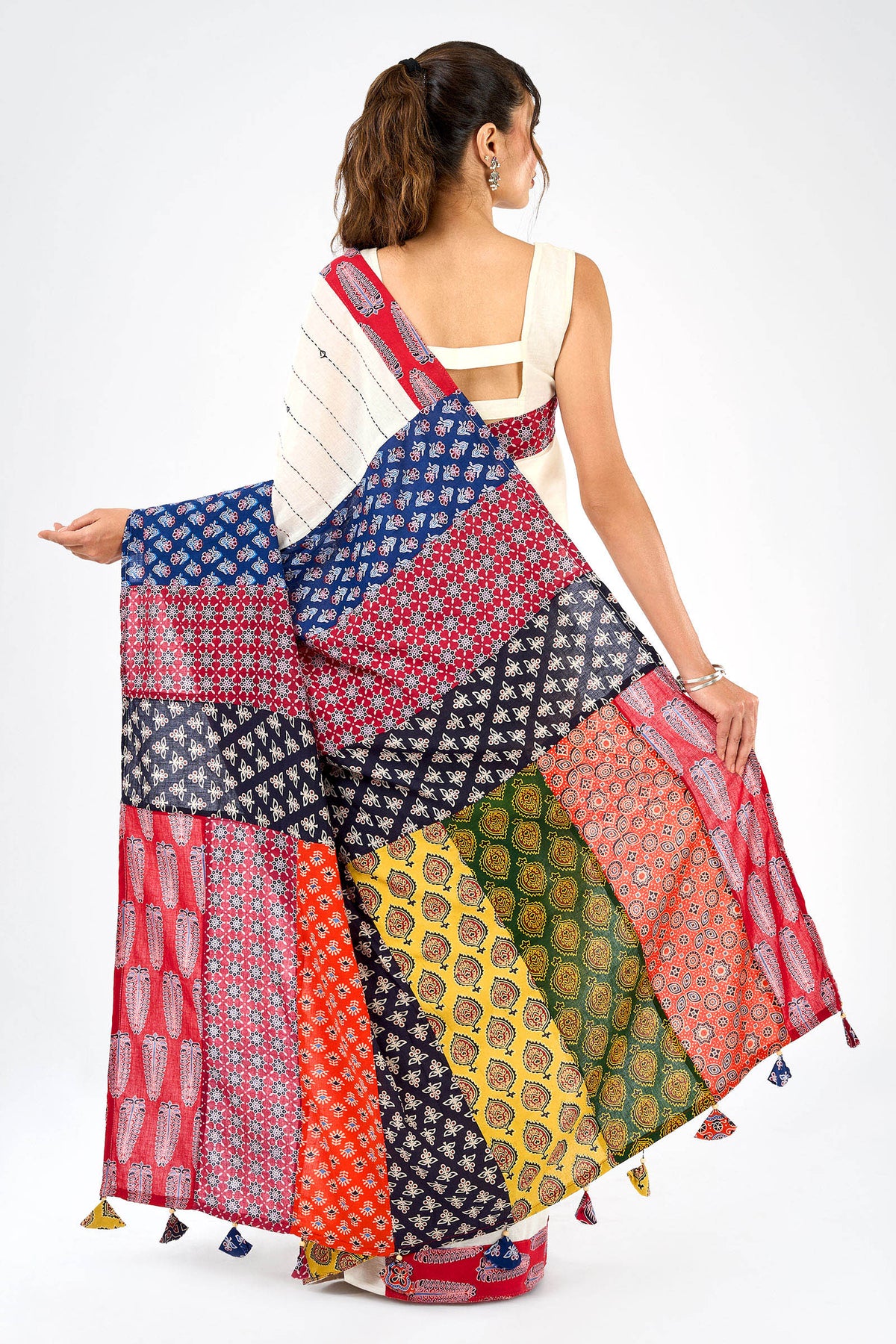 | Disclaimer | The pictures are clicked under studio lighting. Color may vary slightly from the image due to your screen brightness or color saturation for which subtle variations must be acknowledged. This applique saree is hand-stitched by artisans; slight variations in panel placement and colour are natural and add to its unique charm. No two pieces are exactly alike. Since most of our sarees are hand woven, there might be slight irregularities or unevenness in the weave, pattern or selvedge of a saree. Characteristic imperfections associated with hand printing may be observed in certain sarees which results from the human involvement in the process and is a hallmark of handcrafted products |
