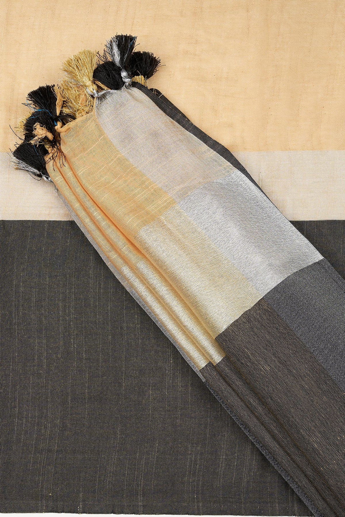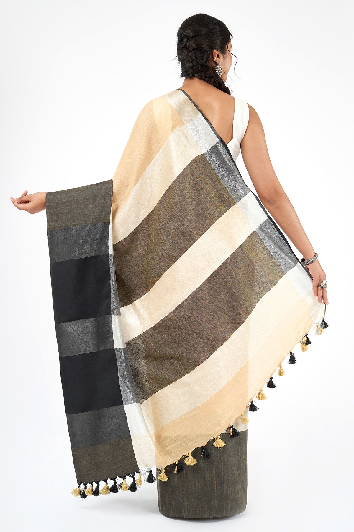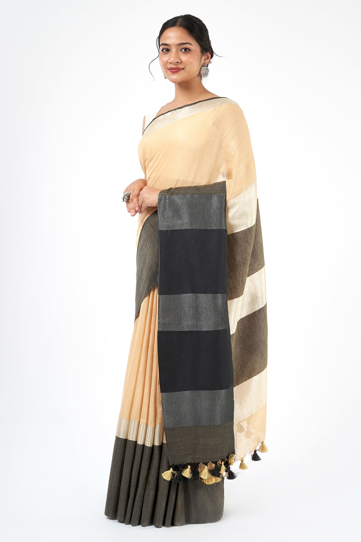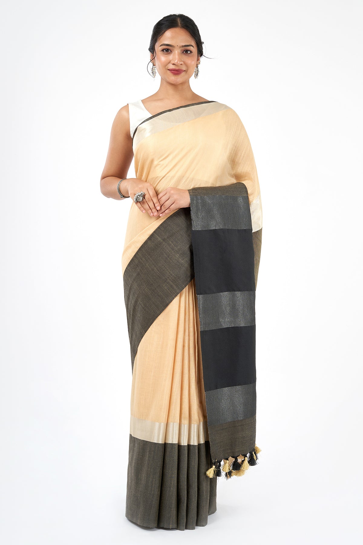 Minimal contrast, maximum style—Chhaya pairs warm beige with classic black for a grounded, modern look. In a soft cotton blend, this saree brings effortless elegance to your daily wardrobe.